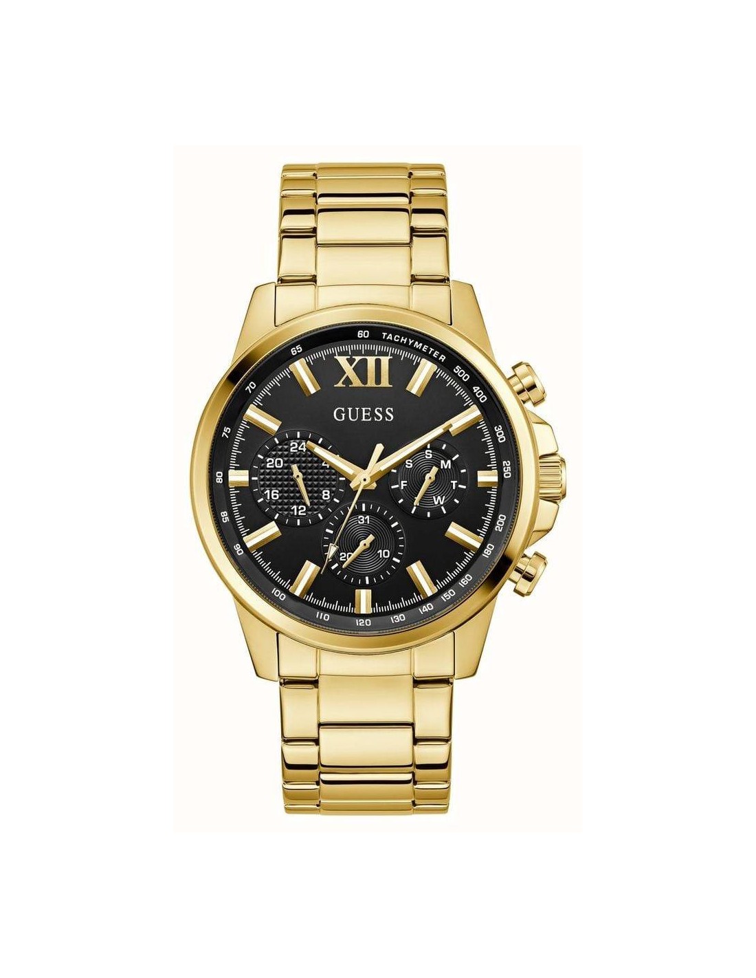 Orologio Guess Walker, multifunzione uomo. Cassa in acciaio pvd oro giallo da 46 mm. Quadrante nero con indici e lancette luminescenti dorate e tachimetro interno. Movimento al quarzo e vetro minerale. Cinturino in acciaio pvd oro giallo. Impermeabilità di 3 atm.