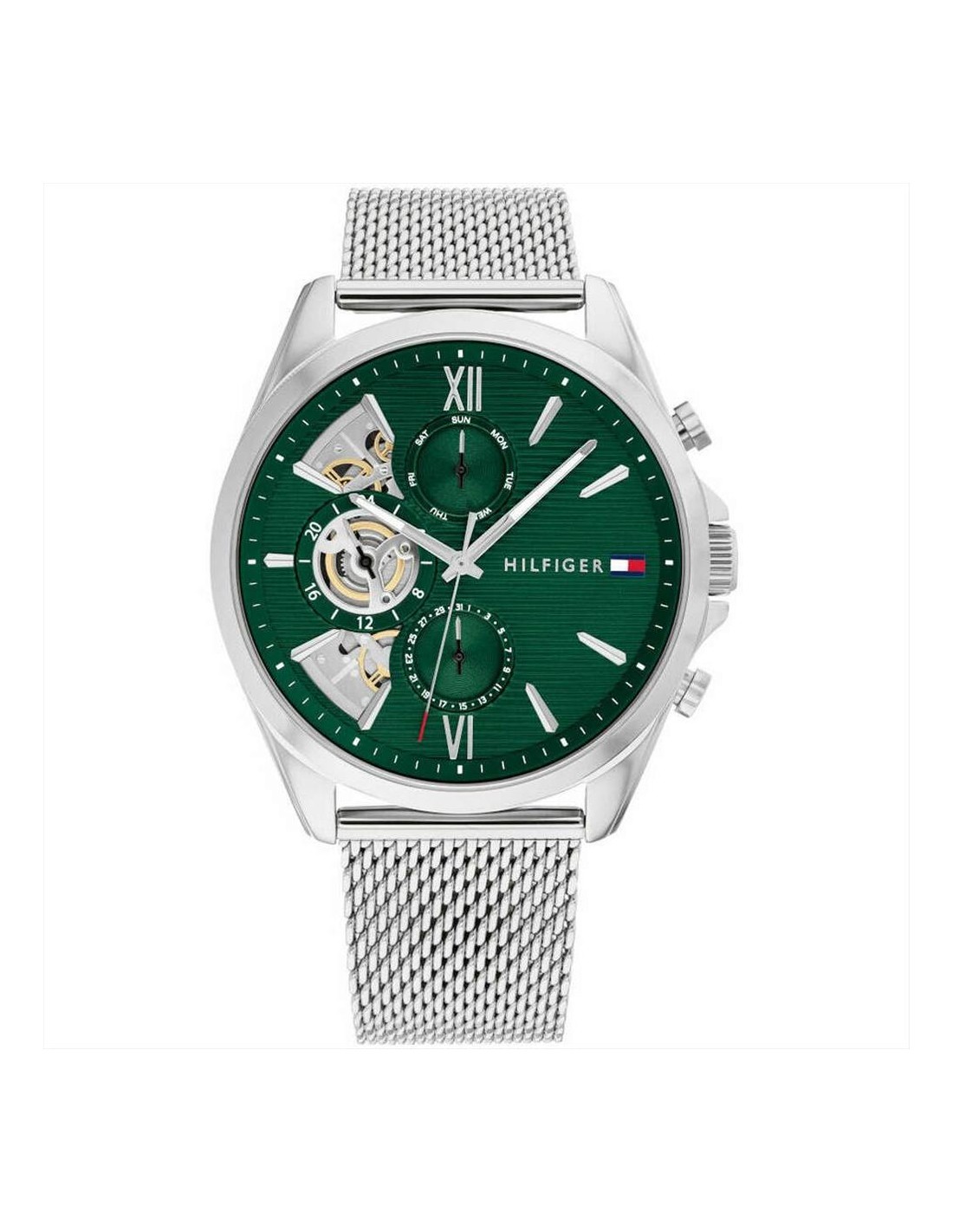 Orologio Tommy Hilfiger Baker, multifunzione uomo. Cassa in acciaio da 44 mm, quadrante verde con indici e lancette silver. Vetro minerale. Movimento al quarzo. Cinturino in acciaio maglia milano e impermeabilità di 5 atm.