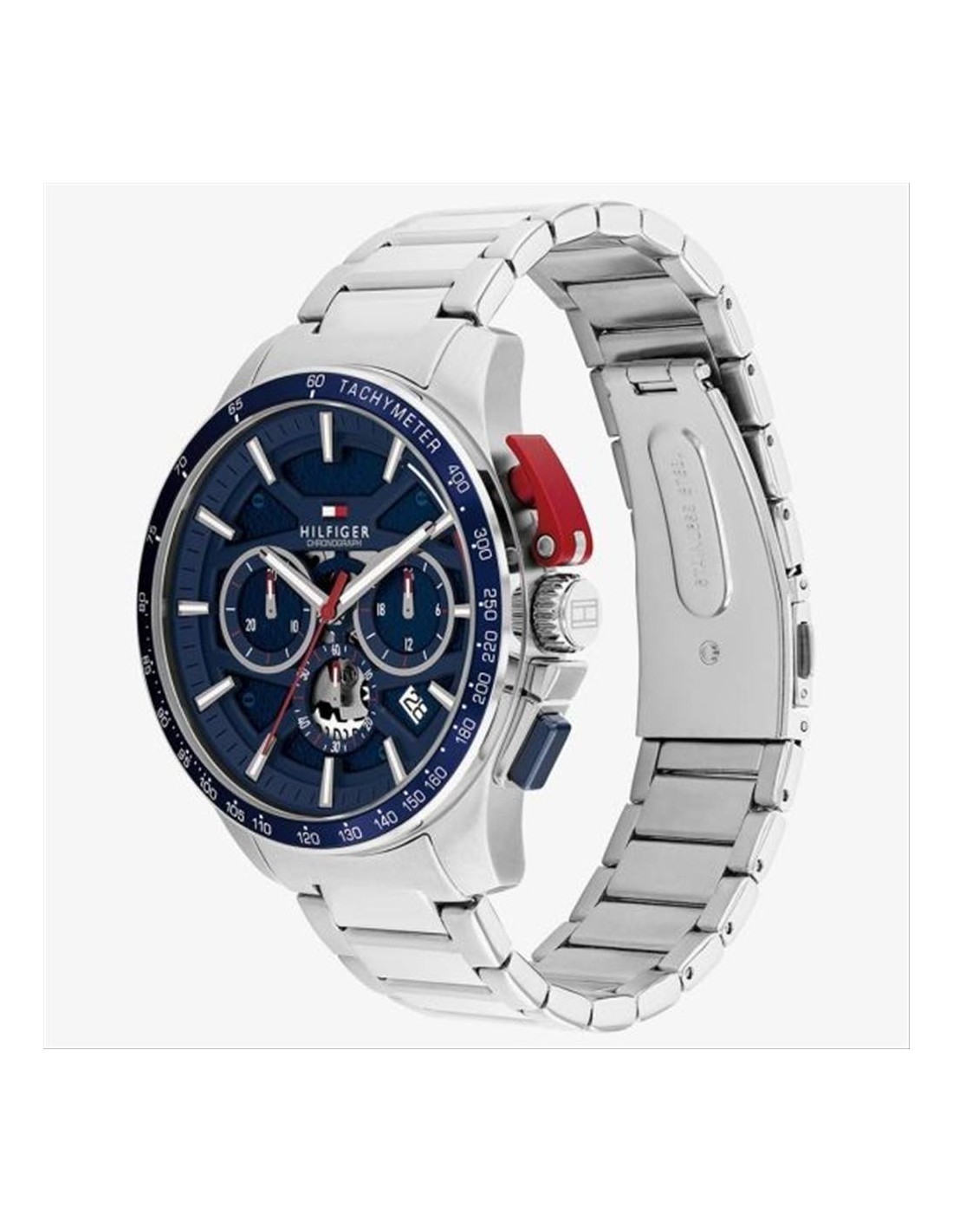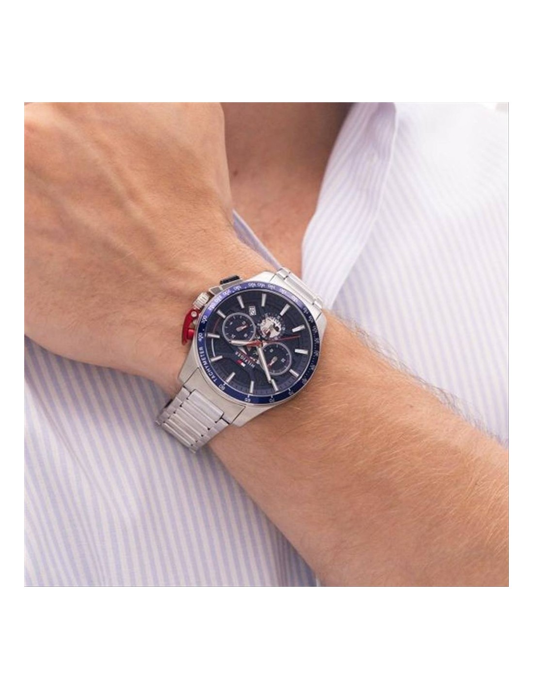 Orologio Tommy Hilfiger Bank, cronografo uomo. Cassa in acciaio da 44 mm, quadrante blu con indici e lancette luminescenti, datario alle ore 4. Movimento al quarzo, e vetro minerale. Cinturino in acciaio. Impermeabilità di 5 atm.