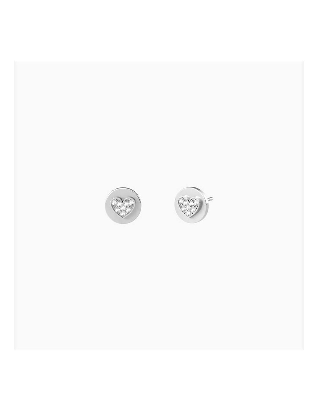 Orecchini Kidult Symbols, in acciaio a lobo tondi con cuore centrale in cristalli bianchi. "Per distinguerti non hai bisogno di effetti speciali. A volte bastano piccoli dettagli per far brillare la tua luce."