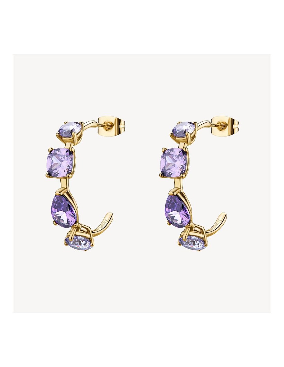 Orecchini Brosway Dreaming, a cerchio in acciaio 316L e finitura pvd oro 14K, con cubic zirconia round, cushion e pear colore ametista.