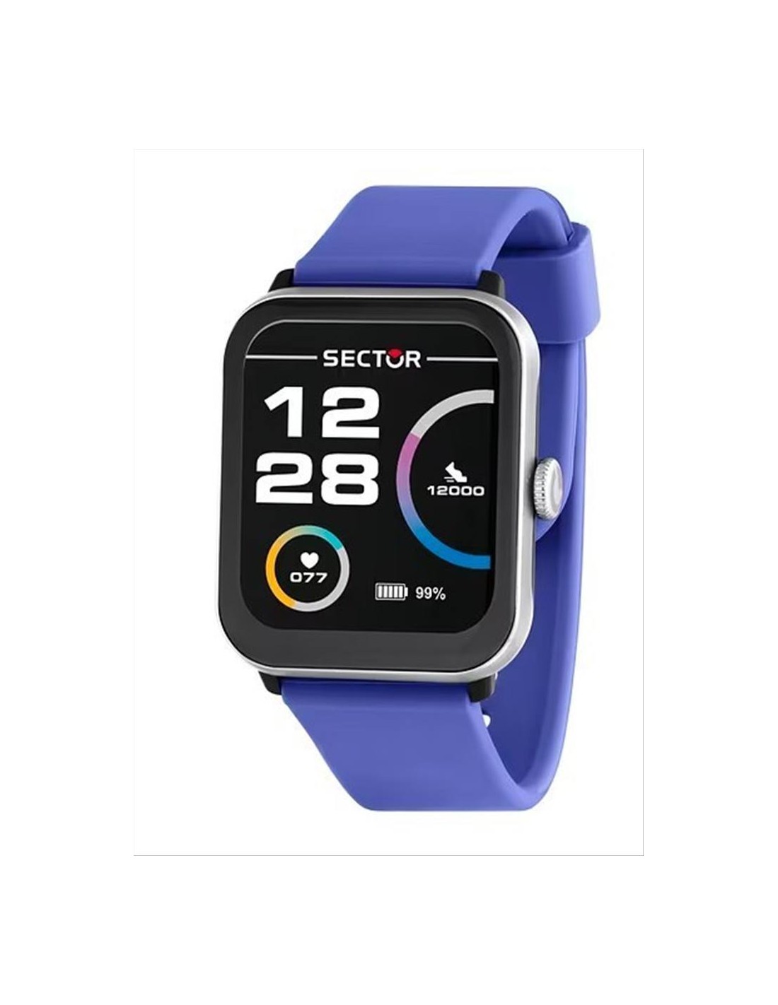 Orologio Sector Smartwatch S-08, unisex. Cassa rettangolare in plastica di dimensioni 37 x 44 mm. Vetro acrilico. Cinturino in silicone color pervinca con chiusura a gioielleria. Funzioni: quadrante animato, ossigeno nel sangue, allenamento del respiro, calorie, fotocamera telecomandata, trova il mio telefono, frequenza cardiaca, telecomando musica, notifiche, monitoraggio del sonno, chiamata in altoparlante, meteo, chiamate Bluetooth, assistente vocale, multi-sport, contapassi, distanza, calorie bruciate. Classificazione di impermeabilità: water resistant IP67 Smartwatch con app dedicata. Compatibile con iOS e Android.