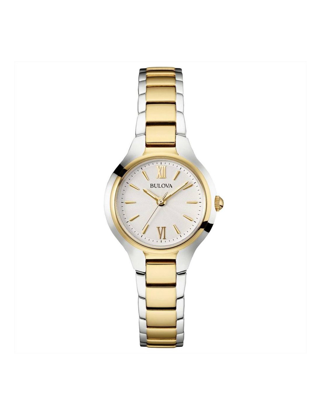 Orologio Bulova, solo tempo donna. Cassa in acciaio da 28 mm, quadrante bianco con lancette e indici dorati, vetro minerale, movimento al quarzo e cinturino in acciaio silver e dorato. Impermeabilità di 3 atm.