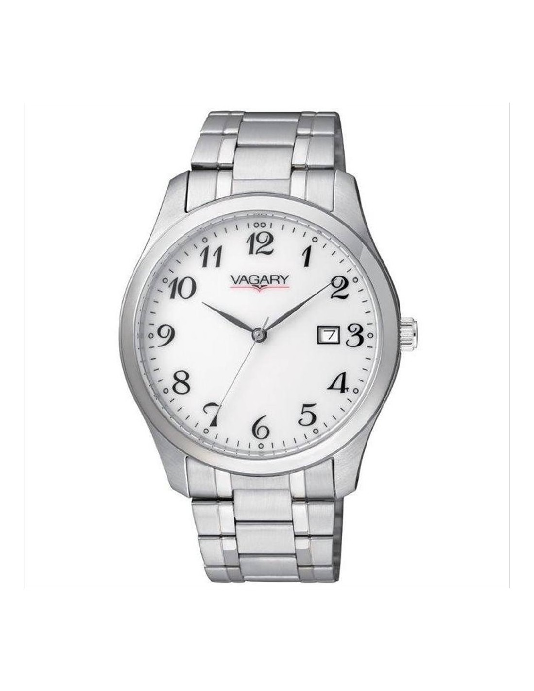 Orologio Vagary, solo tempo uomo. Cassa in acciaio da 38 mm, quadrante bianco con numeri arabi e lancette silver, datario alle ore 3. Movimento al quarzo, vetro minerale, e cinturino in acciaio. Impermeabilità di 5 atm.
