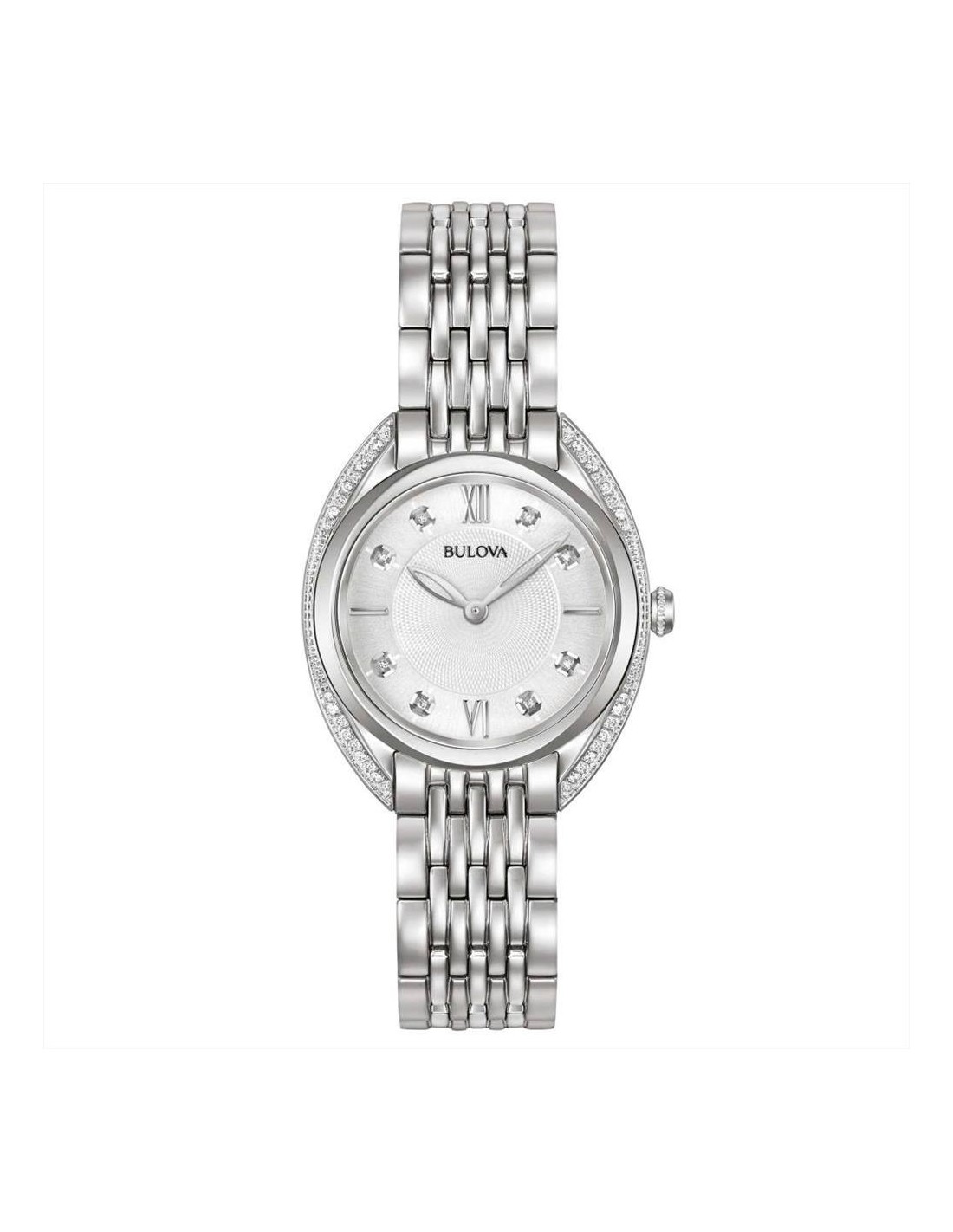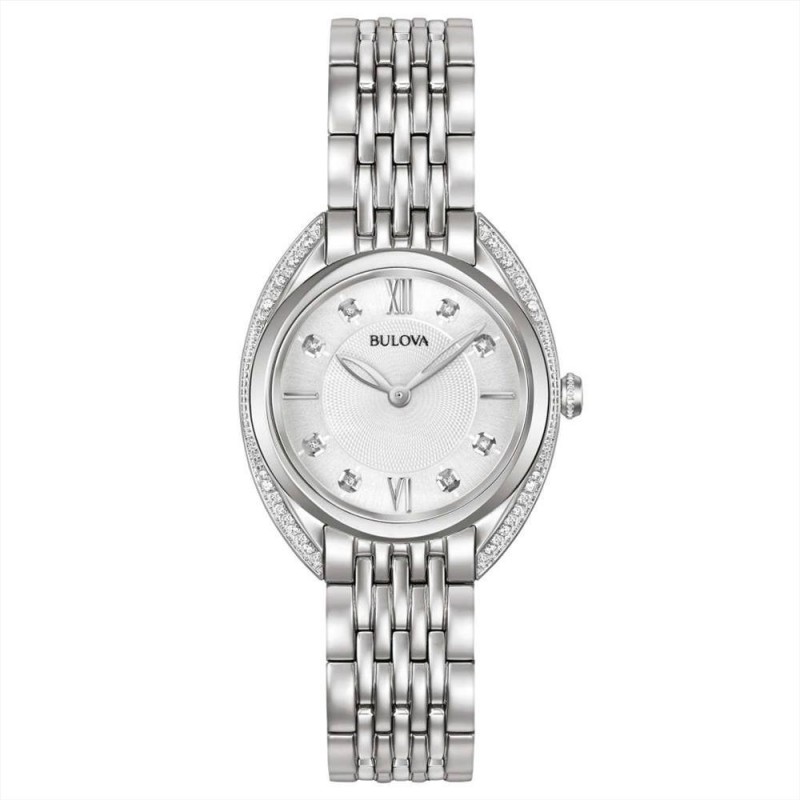 Orologio Bulova, solo tempo donna. Cassa in acciaio da 30 mm con lunetta in diamanti, quadrante silver con lancette luminescenti e diamanti negli indici, vetro zaffiro, movimento al quarzo e cinturino in acciaio silver. Impermeabilità di 3 atm.