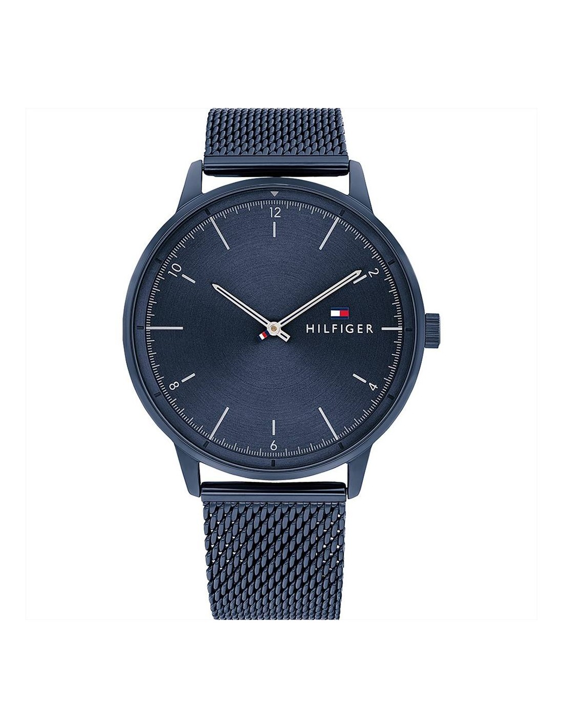 Orologio Tommy Hilfiger, solo tempo uomo. Cassa in acciaio pvd blu da 43mm, quadrante blu con indici e lancette silver, vetro minerale e movimento al quarzo. Cinturino in acciaio pvd blu maglia milano e impermeabilità di 5 atm.