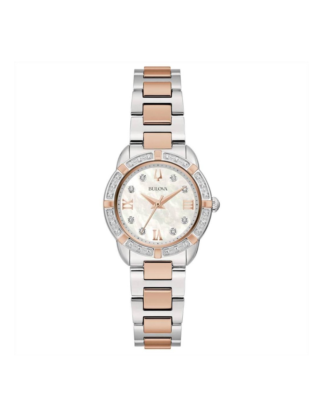 Orologio Bulova Classic Lady, solo tempo donna. Cassa in acciaio da 27 mm con lunetta in diamanti, quadrante in madreperla bianca con lancette rosè e diamanti negli indici, vetro minerale, movimento al quarzo e cinturino in acciaio silver e rosè. Impermeabilità di 3 atm.