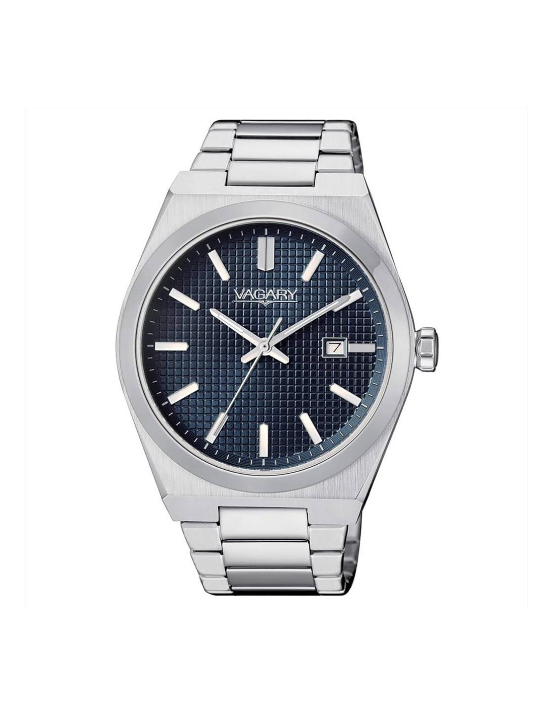 Orologio Vagary Timeless, solo tempo uomo. Cassa in acciaio da 40 mm, quadrante blu con indici e lancette silver, datario alle ore 3. Movimento al quarzo, vetro minerale, e cinturino in acciaio. Impermeabilità di 5 atm.