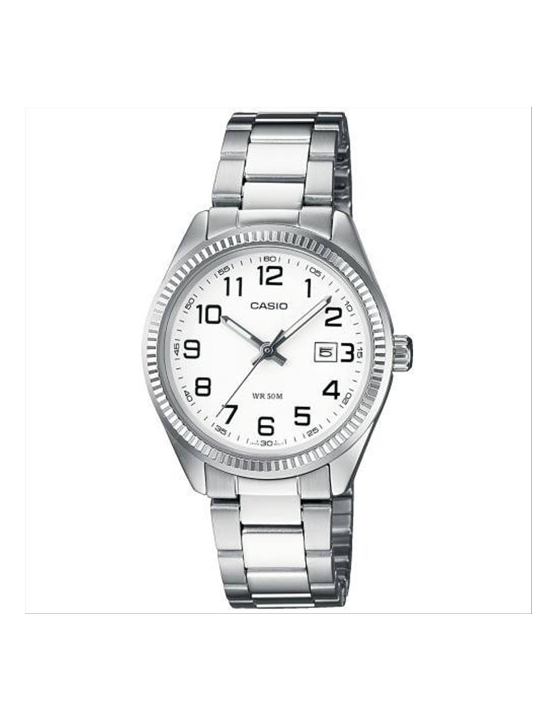 Orologio Casio, solo tempo donna. Cassa in acciaio silver, quadrante bianco con numeri arabi neri e lancette luminescenti. Ghiera zigrinata, datario alle ore 3, vetro minerale, e cinturino in acciaio silver.