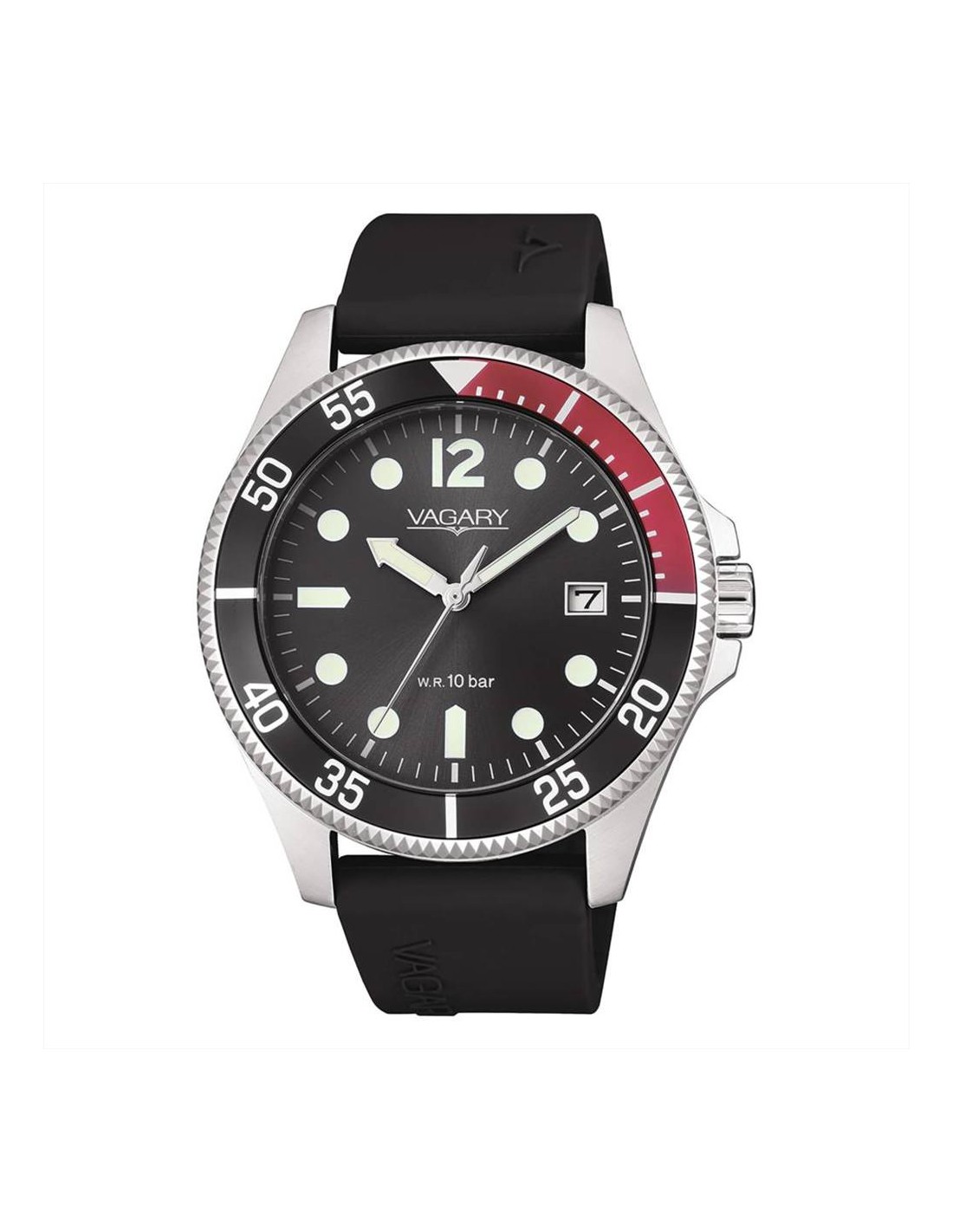 Orologio Vagary Aqua39, solo tempo uomo. Cassa in acciaio da 41 mm, quadrante ner con indici e lancette luminescenti, datario alle ore 3. Ghiera girevole unidirezionale nero e rossa, movimento al quarzo, vetro minerale, e cinturino in silicone nero. Impermeabilità di 10 atm.