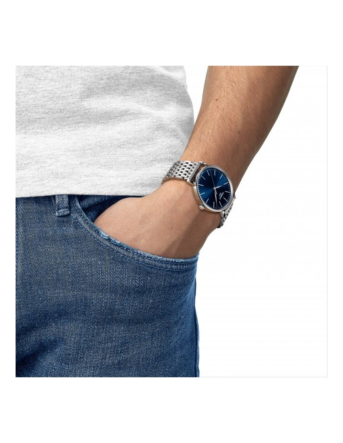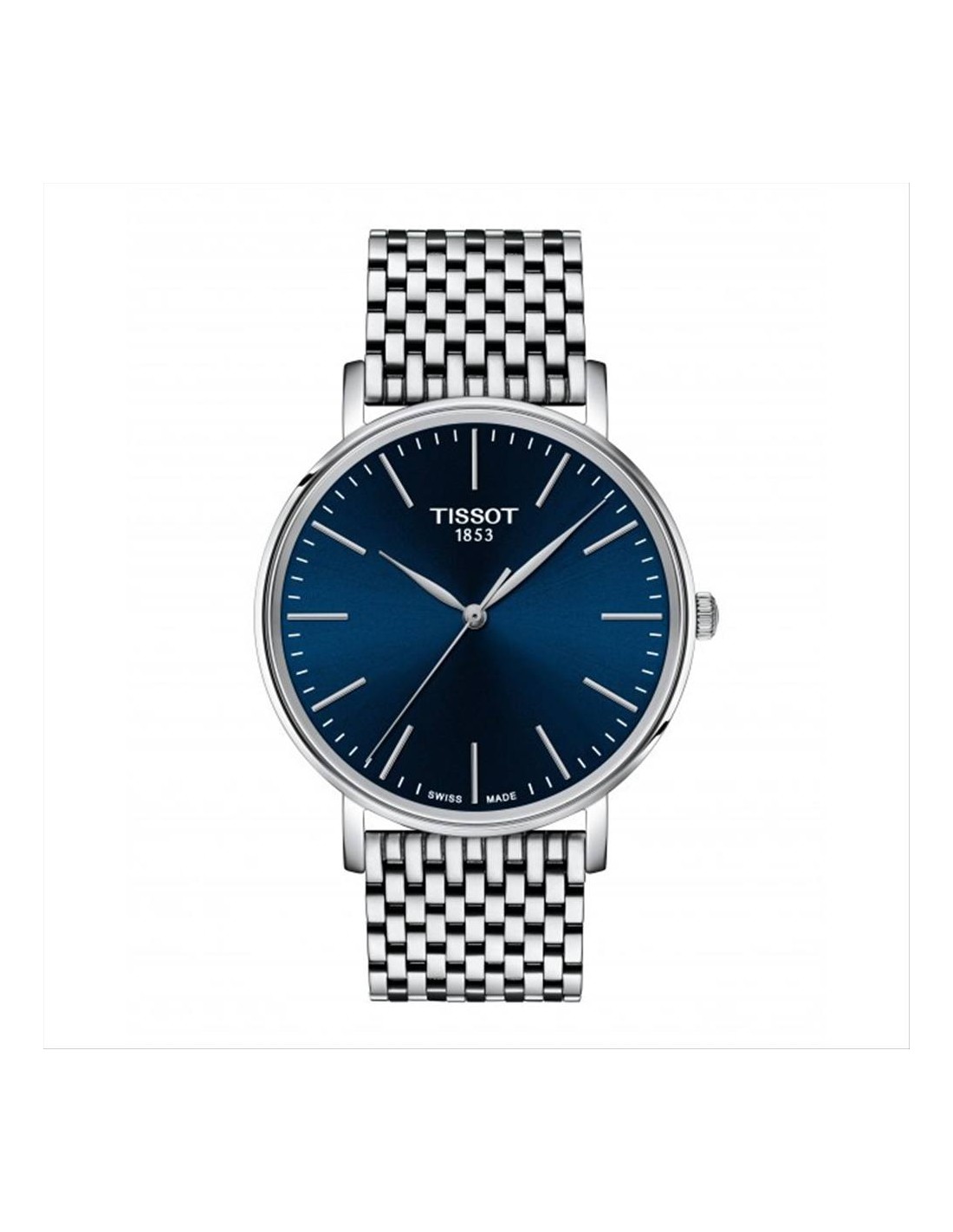 Orologio Tissot Everytime, solo tempo uomo. Cassa in acciaio 40 mm, quadrante blu con indici e lancette silver. Vetro zaffiro antigraffio, movimento svizzero al quarzo, cinturino in acciaio silver. Impermeabilità di 10 atm.