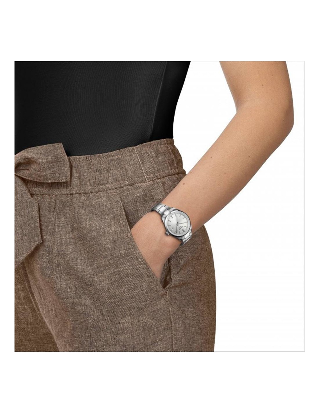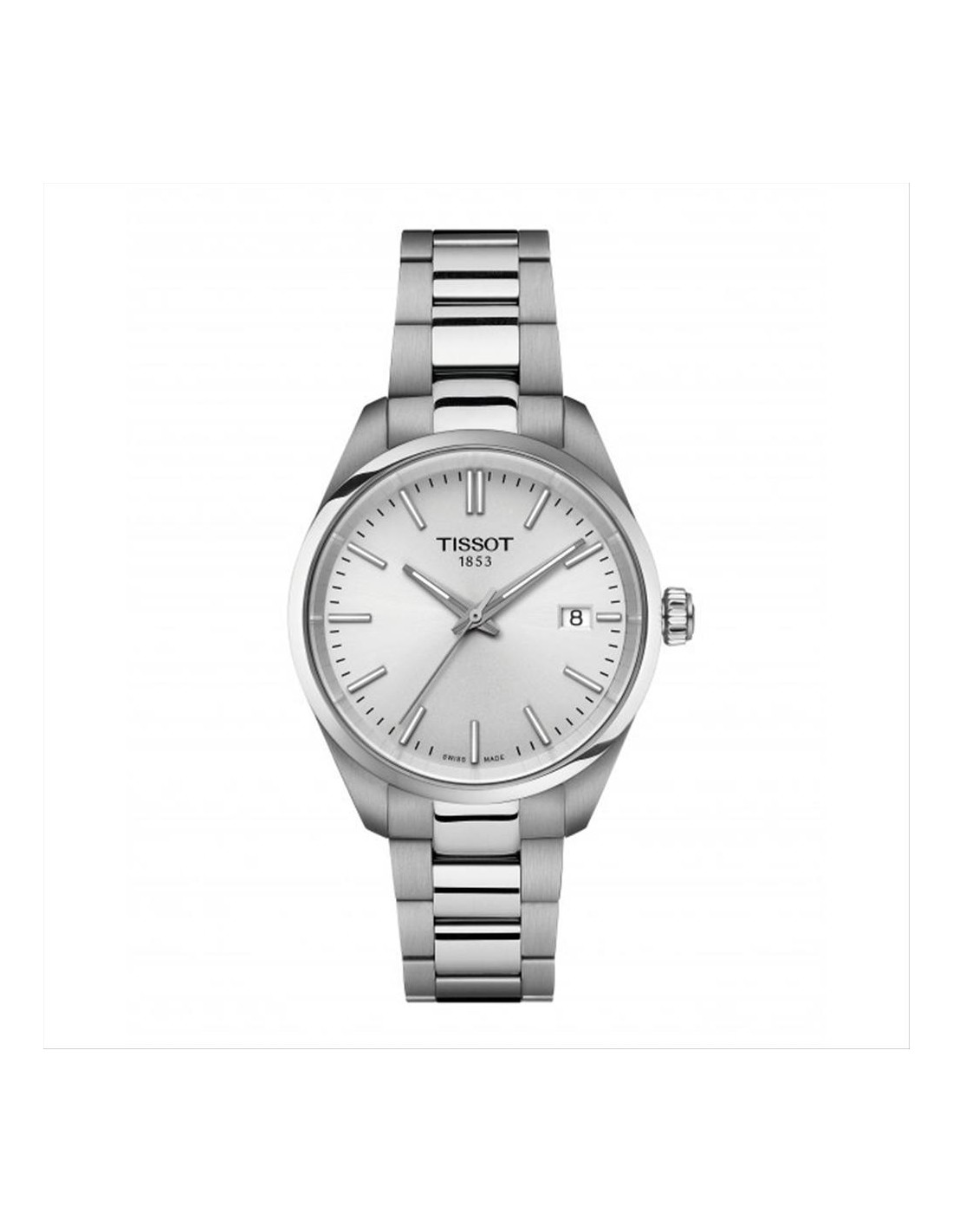 Orologio Tissot PR100, solo tempo. Cassa in acciaio da 34 mm, quadrante silver con indici e lancette luminescenti, datario alle ore 3. Vetro zaffiro antigraffio, movimento al quarzo, e cinturino in acciaio intercambiabile a sgancio rapido. Chiusura a farfalla con pulsanti. Impermeabilità di 10 atm.