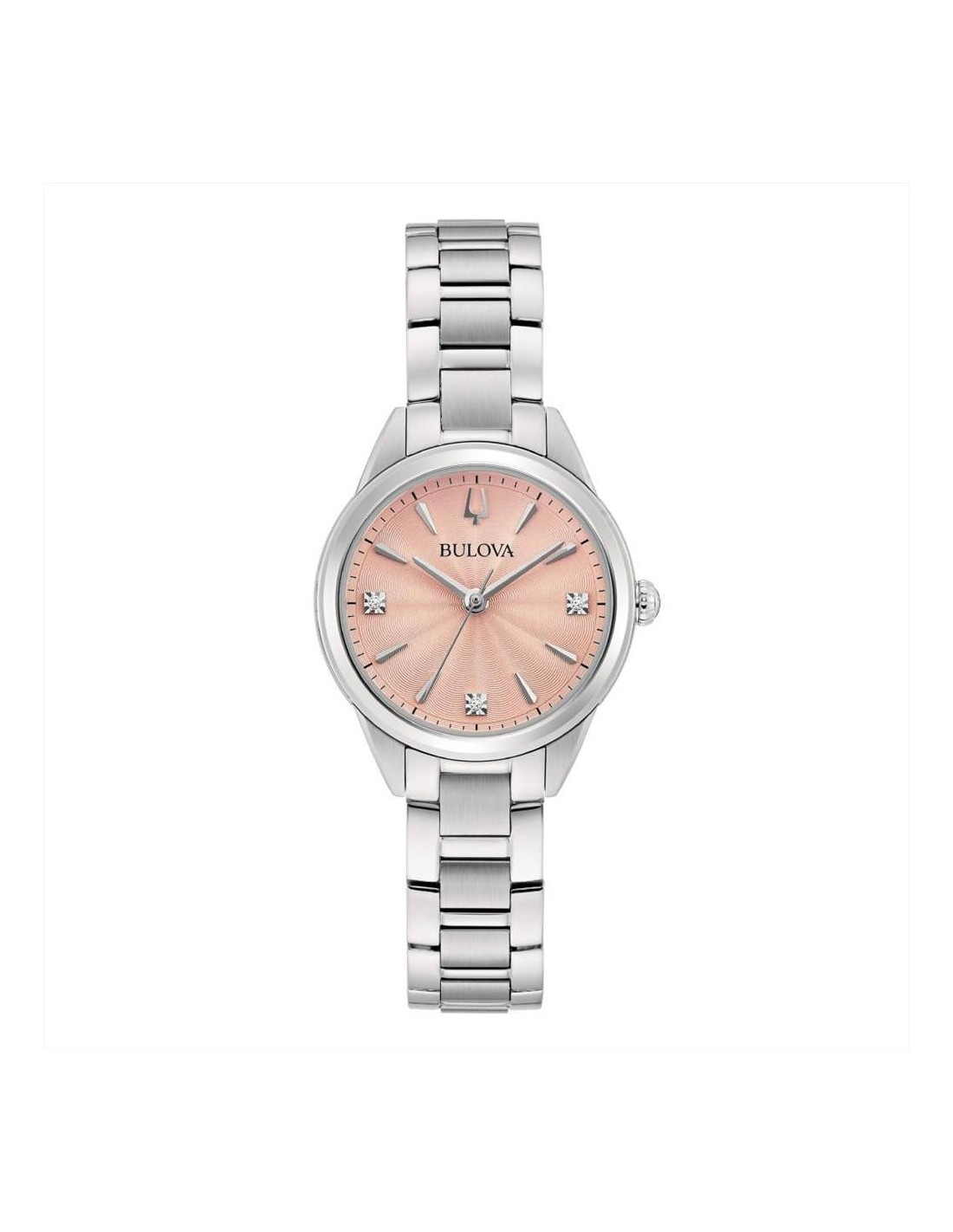 Orologio Bulova Sutton Lady Petite, solo tempo donna. Cassa in acciaio da 28 mm, quadrante rosa con lancette silver e 3 diamanti, vetro minerale, movimento al quarzo e cinturino in acciaio silver. Impermeabilità di 3 atm.