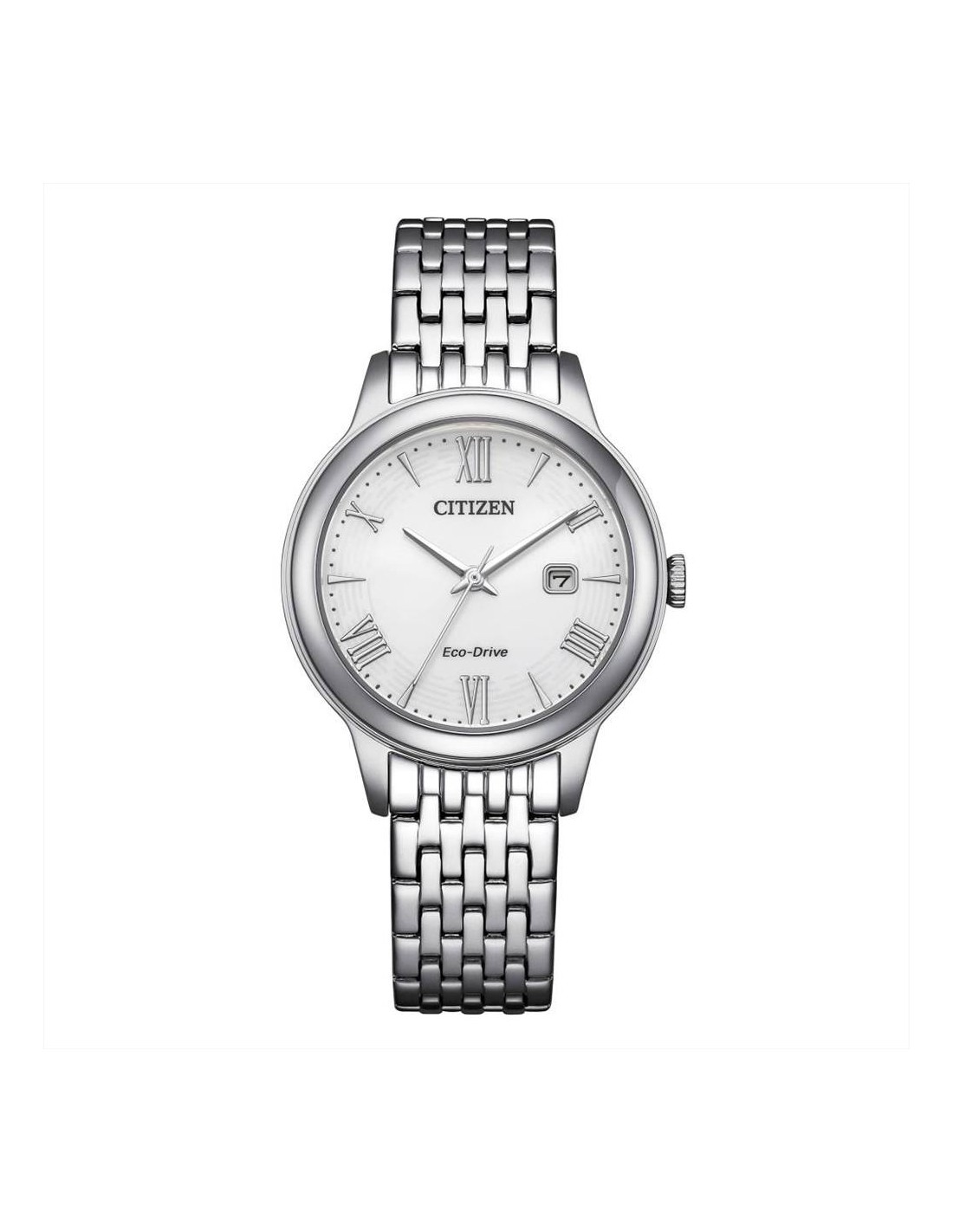 Orologio Citizen Lady, solo tempo donna. Cassa in acciaio silver da 31 mm, quadrante bianco con numeri romani silver e lancette silver. Vetro minerale. Movimento eco drive a carica luce con riserva di carica di 180 giorni, e cinturino in acciaio silver. Impermeabilità di 5 atm.