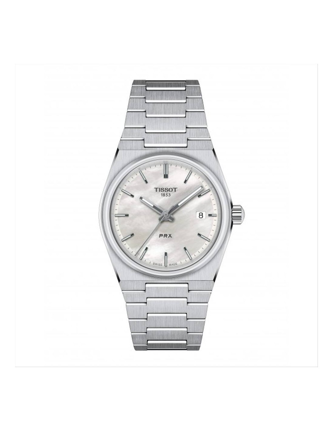 Orologio Tissot PRX 35mm, solo tempo donna. Cassa in acciaio 35 mm a forma tonneau, quadrante in madreperla bianca con indici e lancette silver luminescenti, datario alle ore 3, vetro zaffiro antigraffio con trattamento antiriflesso, movimento al quarzo, cinturino in acciaio silver. Impermeabilità di 10 atm.