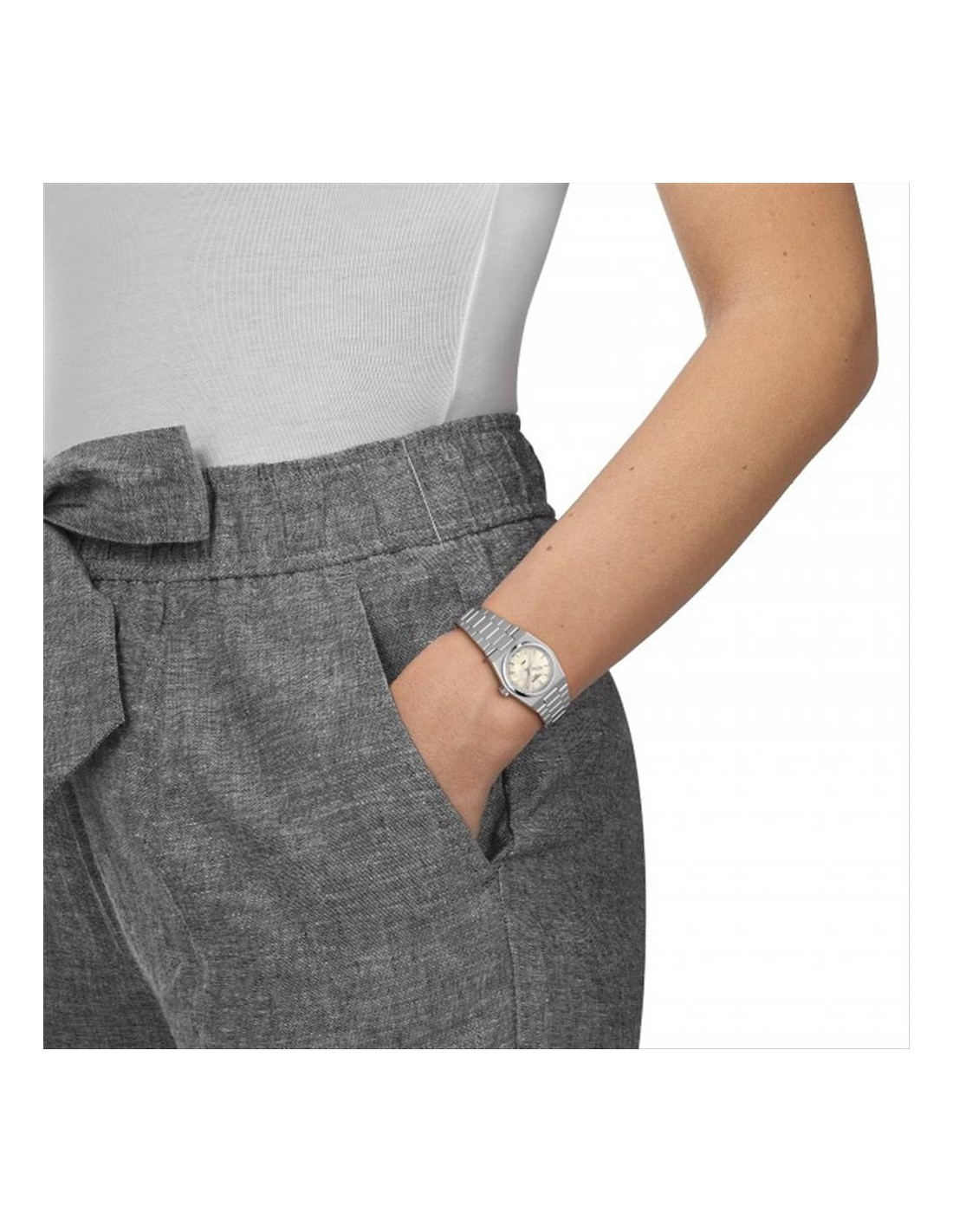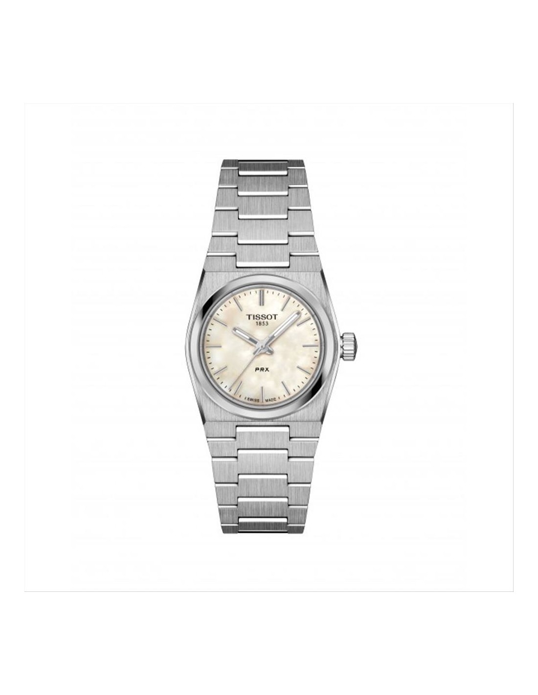 Orologio Tissot PRX 25mm, solo tempo donna. Cassa in acciaio da 25 mm, quadrante in madreperla bianca con lancette luminescenti e indici silver. Movimento al quarzo e vetro zaffiro antigraffio con rivestimento antiriflesso. Cinturino in acciaio. Impermeabilità di 10 atm