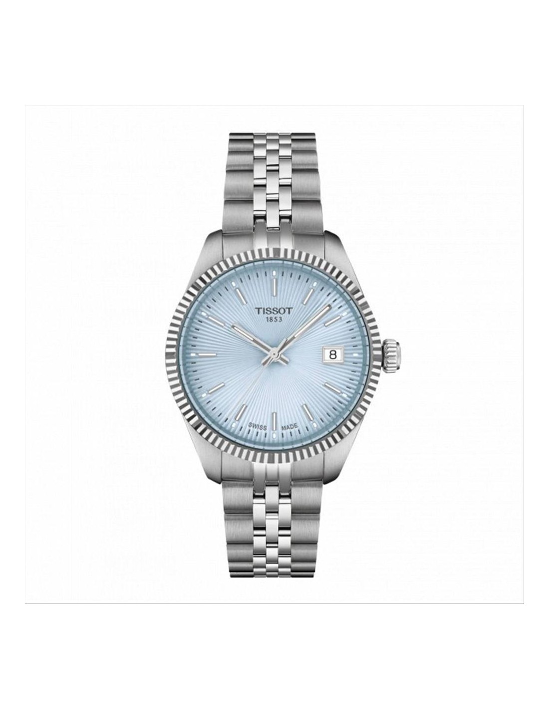 Orologio Tissot Ballade 34mm, solo tempo donna. Cassa in acciaio 34 mm, quadrante celeste con indici e lancette luminescenti silver. Datario alle ore 3. Vetro zaffiro antigraffio, lunetta zigrinata, movimento svizzero al quarzo, cinturino in acciaio silver. Impermeabilità di 10 atm.