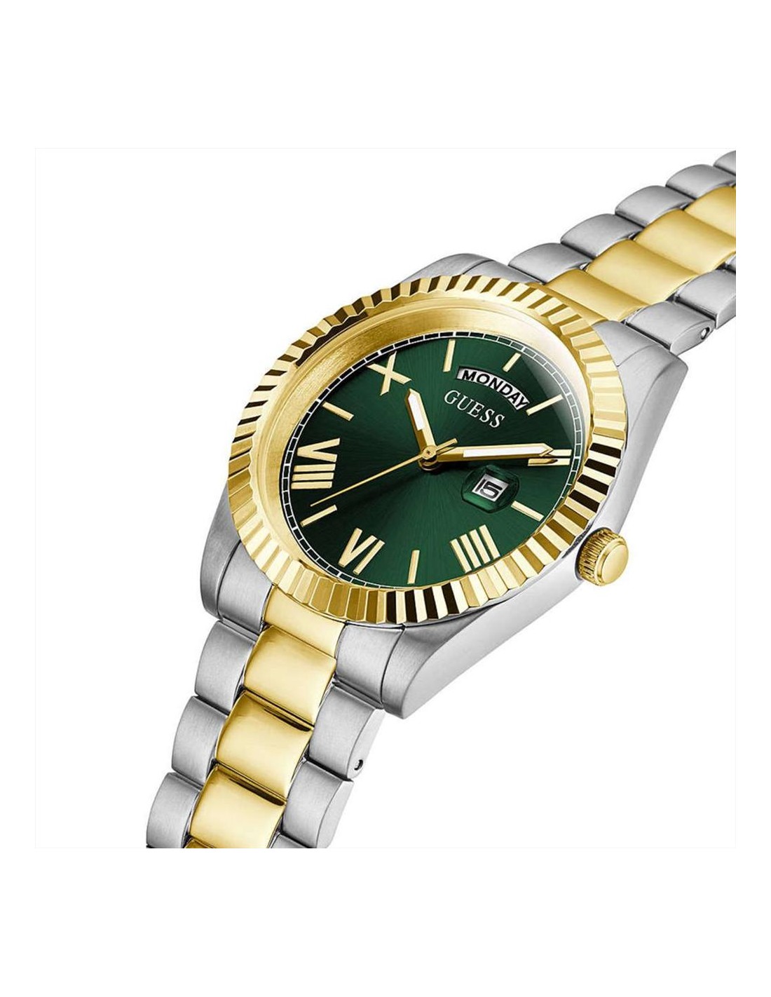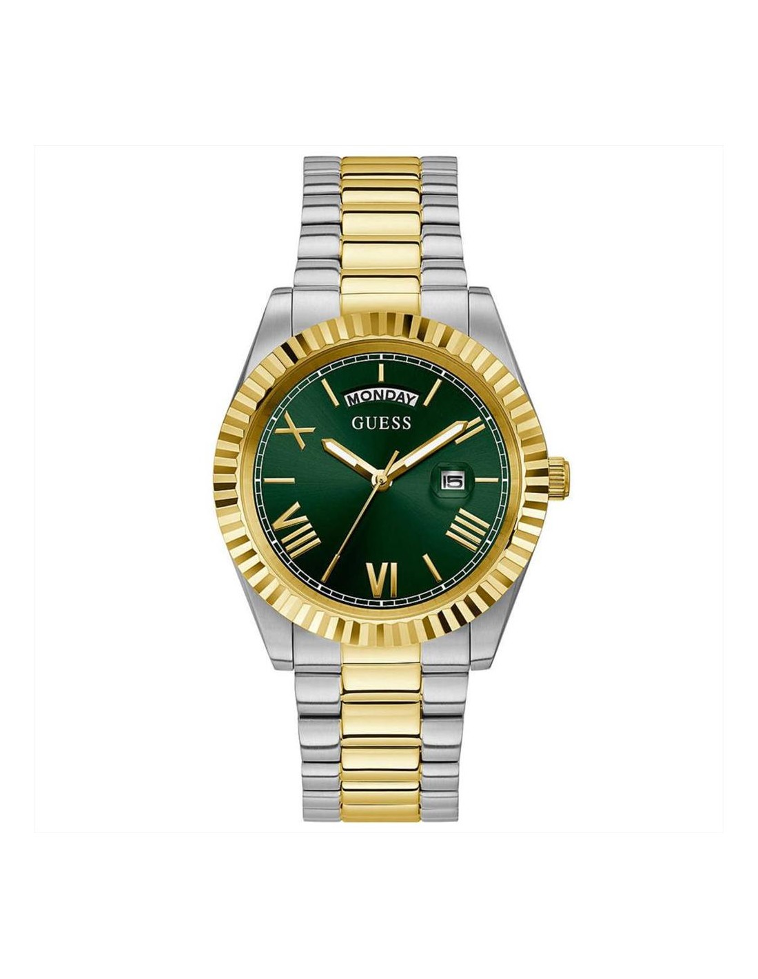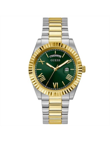 Orologio Guess Connoisseur, solo tempo uomo. Cassa in acciaio silver da 42 mm. Quadrante verde con numeri romani dorati e lancette luminescenti. Lunetta dorata zigrinata. Movimento al quarzo e vetro minerale. Cinturino in acciaio bicolore silver e dorato. Impermeabilità di 5 atm.