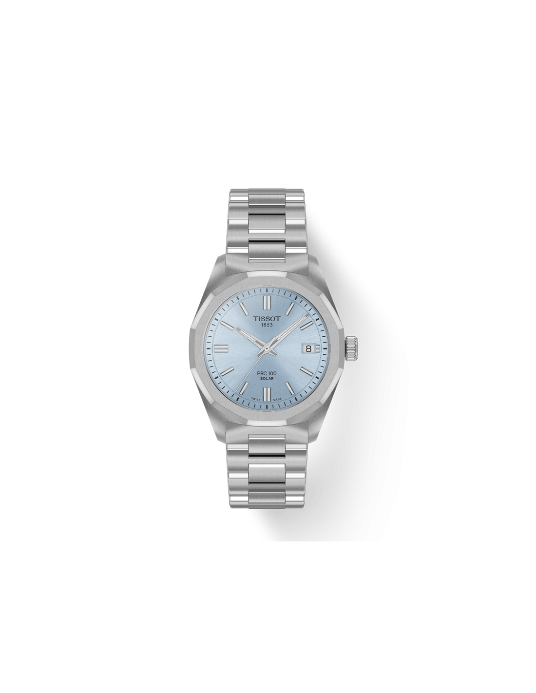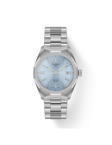 Orologio Tissot PRC 100 Solar 34mm. Cassa in acciaio da 34 mm, quadrante celeste con indici e lancette luminescenti, datario a ore 3. Lunetta dodecagonale. Vetro zaffiro e movimento al quarzo a energia solare, progettato per ricaricarsi senza fatica sia con la luce naturale che con quella artificiale. Cinturino in acciaio. Impermeabilità di 10 atm.