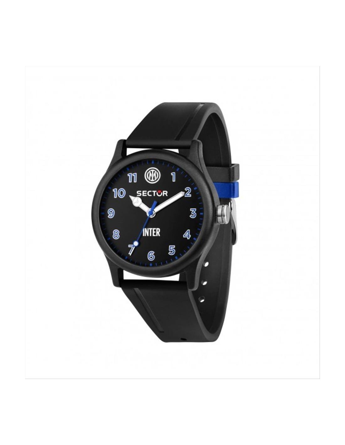 Orologio Sector Ex-Q Inter, solo tempo uomo. Cassa in materiale sintetico di 41 mm, quadrante nero con numeri arabi e lancette bianche, e dettagli blu. Vetro acrilico e movimento al quarzo. Cinturino in silicone nero. Impermeabilità di 5 atm.