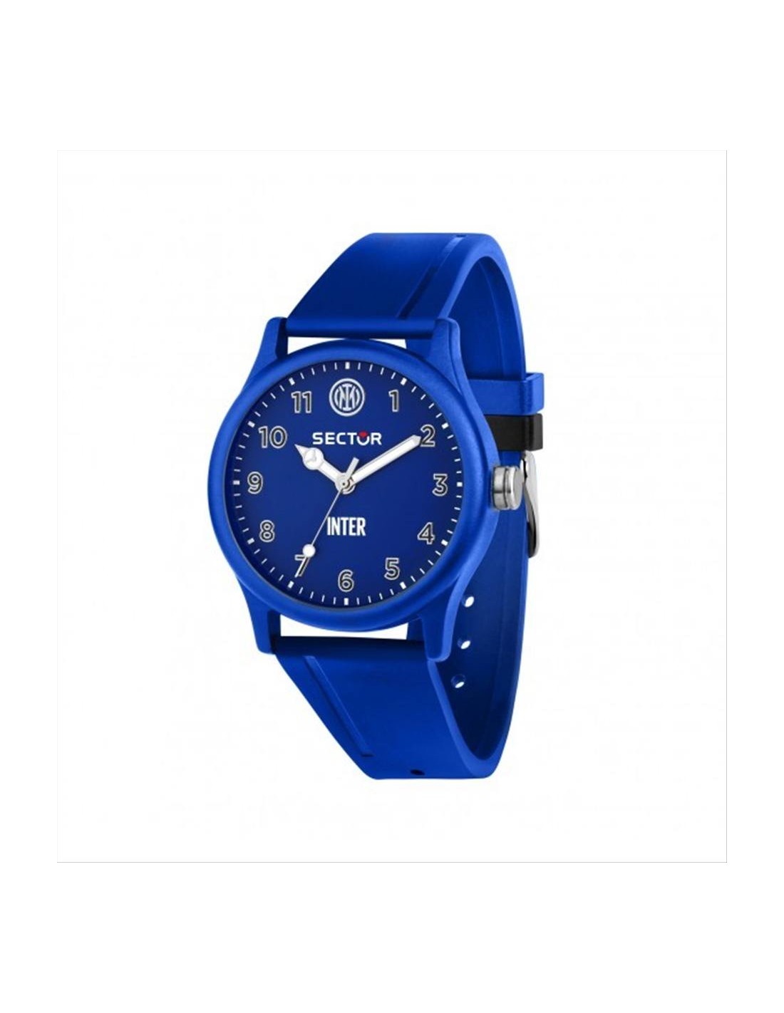 rologio Sector Ex-Q Inter, solo tempo uomo. Cassa in materiale sintetico di 41 mm, quadrante blu con numeri arabi e lancette bianche. Vetro acrilico e movimento al quarzo. Cinturino in silicone blu. Impermeabilità di 5 atm.