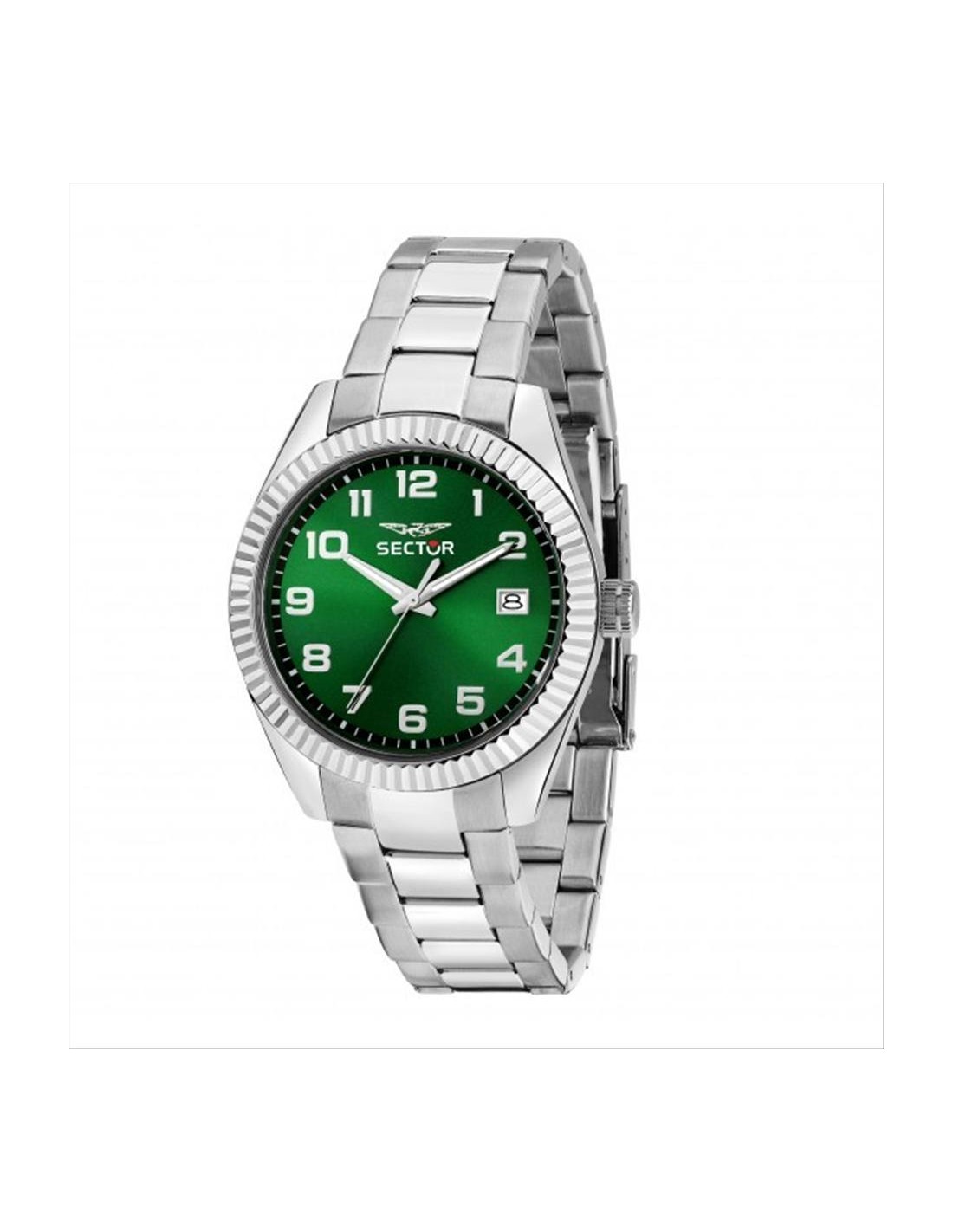 Orologio Sector 240, solo tempo uomo. Cassa in acciaio da 39 mm, quadrante verde con numeri arabi silver e datario a ore 3. Lunetta zigrinata. Vetro minerale e movimento al quarzo. Cinturino in acciaio anallergico. Impermeabilità di 5 atm.