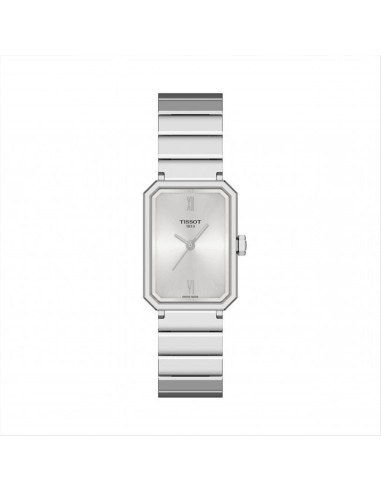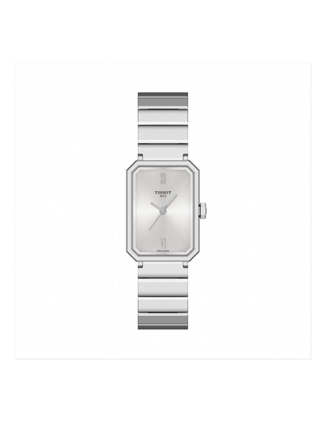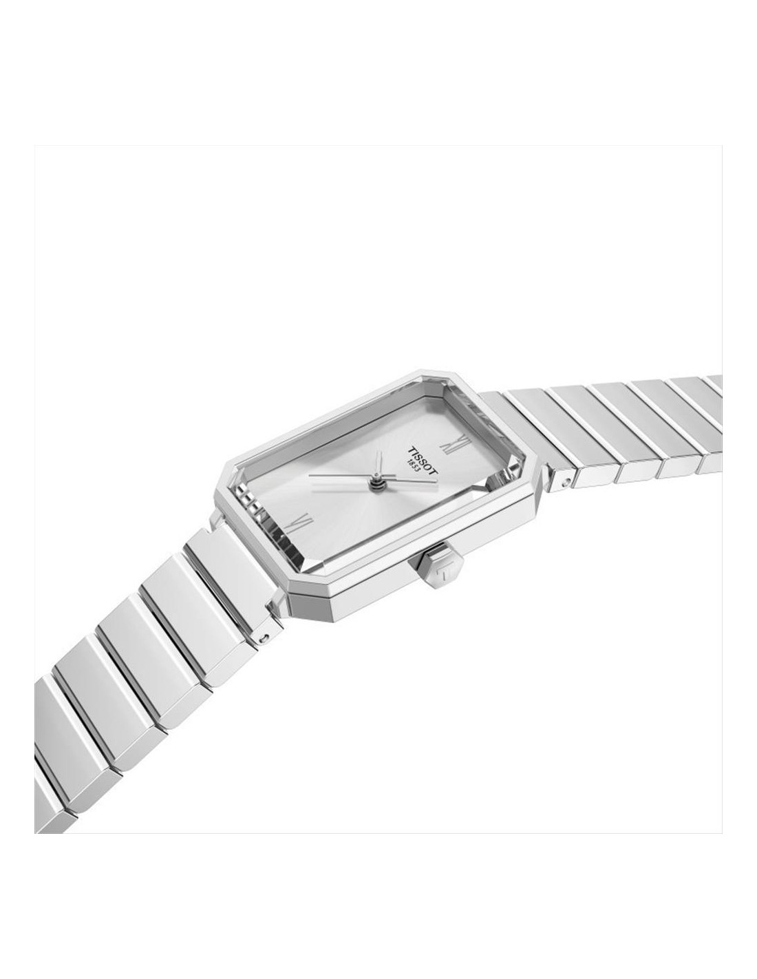 Orologio Tissot SRV, solo tempo donna. Si ispira all'Art Déco degli anni '20, epoca caratterizzata da forme geometriche e motivi astratti. Più che un nome, SRV sta per Sapphire Rectangle V: un vetro zaffiro sfaccettato con una silhouette rettangolare, e la "V" un omaggio alla sua impermeabilità di 5 bar, simboleggiata dal numero romano 5. Cassa in acciaio inossidabile di forma rettangolare di 30 mm, quadrante silver con lancette silver. Movimento al quarzo svizzero. Vetro zaffiro antigraffio. Cinturino in acciaio con chiusura a farfalla a pulsanti offre comfort e sicurezza, ed è dotato di sistema quick-release per un cambio cinturino semplice e immediato.