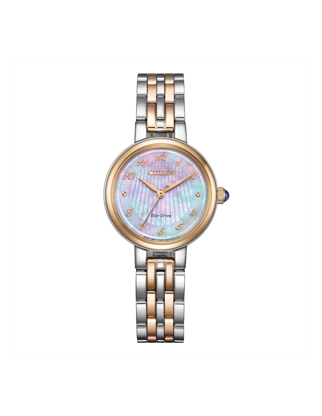 Orologio Citizen Lady, solo tempo donna. Cassa in acciaio da 28 mm. Quadrante in madreperla rosa con numeri arabi. Movimento eco-drive a carica luce con riserva di carica di 180 giorni. Vetro zaffiro. Lunetta dorata. Cinturino in acciaio bicolore dorato/ silver. Impermeabilità di 5 atm.