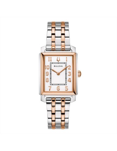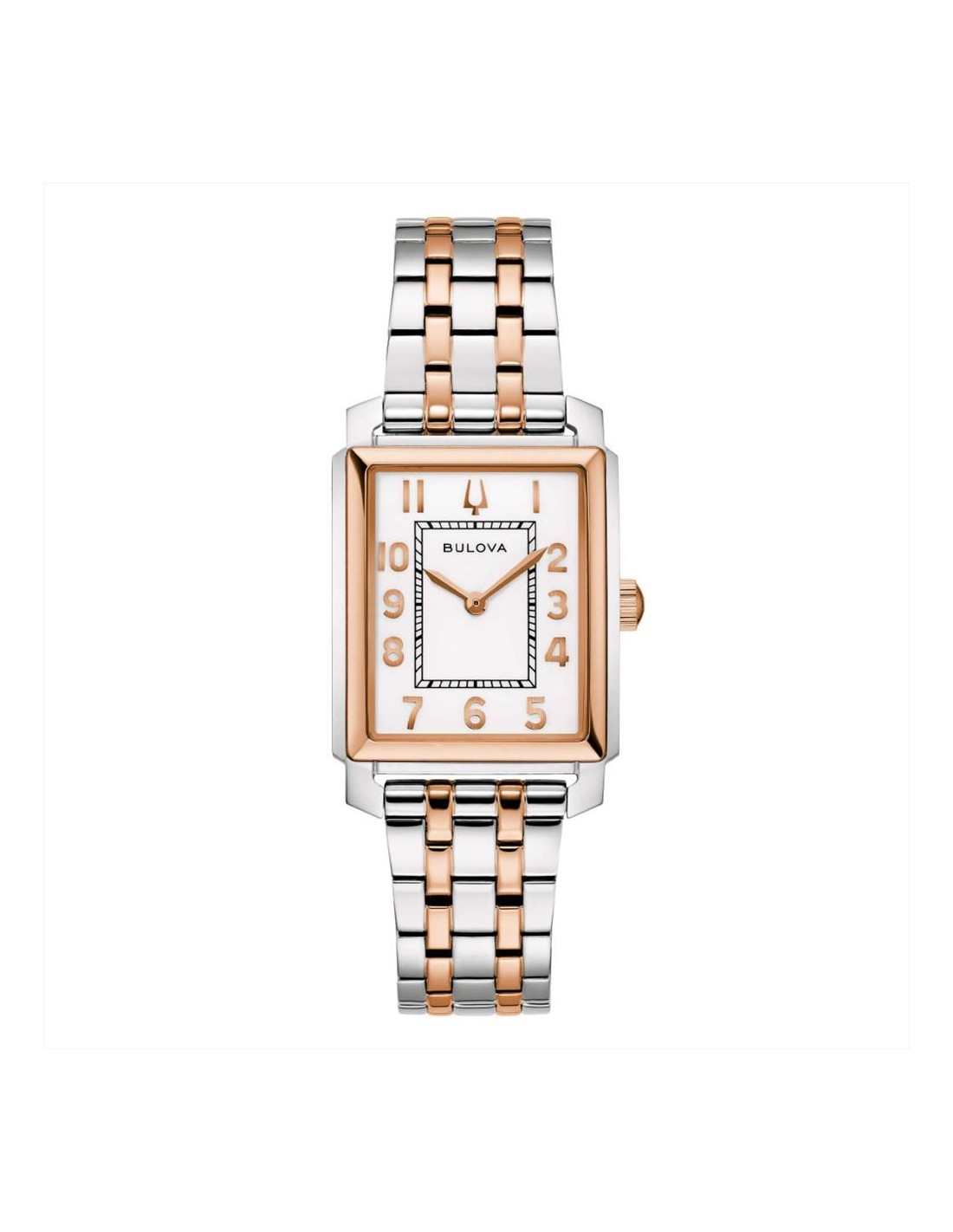 Orologio Bulova Sutton Tank, solo tempo donna. Cassa rettangolare in acciaio silver da 25 mm, quadrante bianco con numeri arabi e lancette rosè. Lunetta rosè. Vetro minerale, movimento al quarzo e cinturino in acciaio bicolore silver e rosè. Impermeabilità di 3 atm.