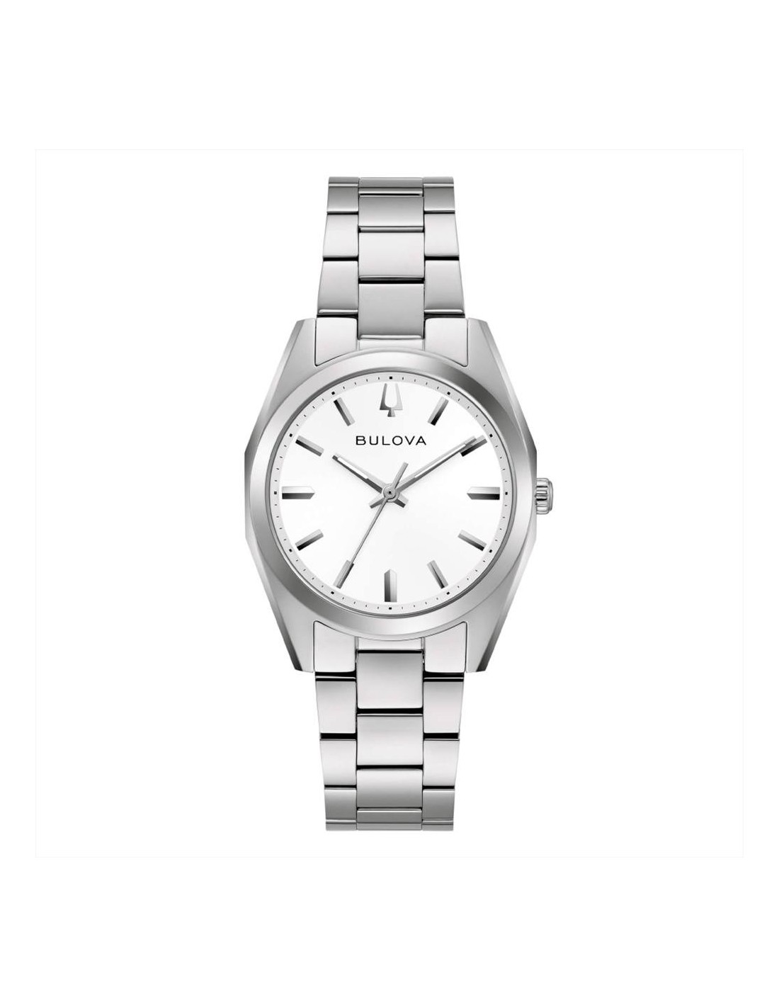 Orologio Bulova Surveyor Lady, solo tempo donna. Cassa in acciaio da 31 mm, quadrante bianco con indici e lancette silver, datario a ore 6. Vetro minerale, movimento al quarzo e cinturino in acciaio silver. Impermeabilità di 3 atm.