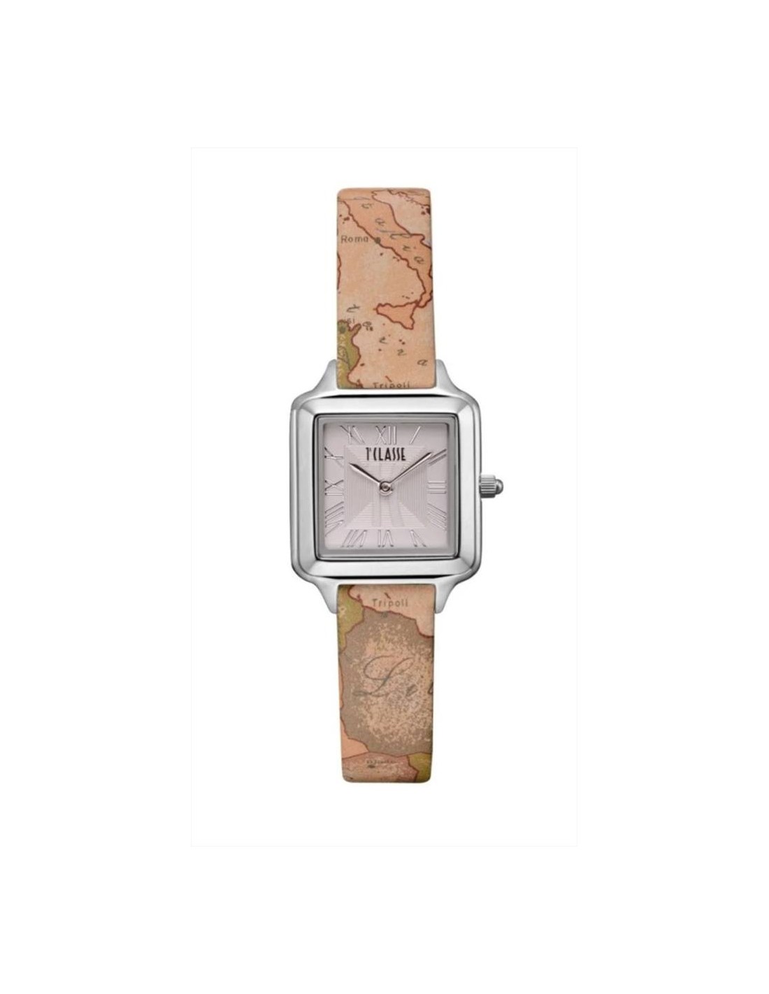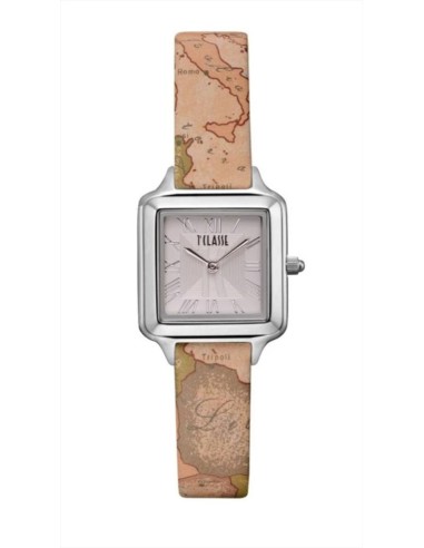 Orologio Alviero Martini 1 Classe, solo tempo donna. Cassa in acciaio silver di forma quadrata da 24 mm, quadrante silver con numeri romani e lancette silver. Vetro minerale, movimento al quarzo, e cinturino in pelle color marrone con mappa geo. Impermeabilità di 3 atm