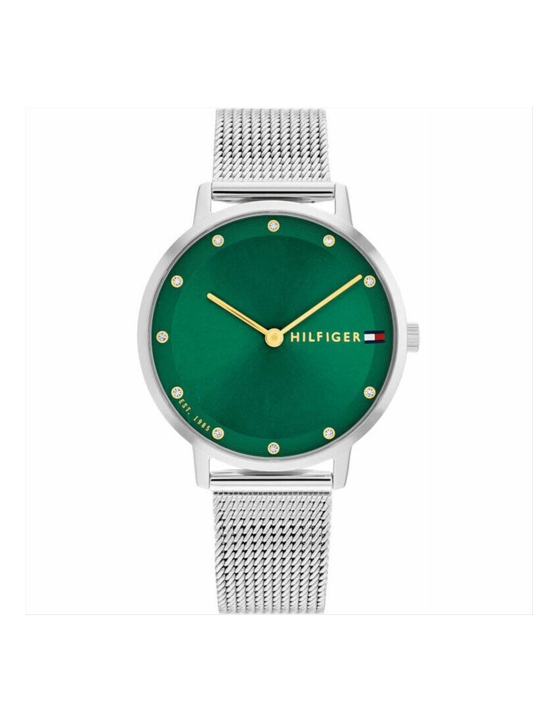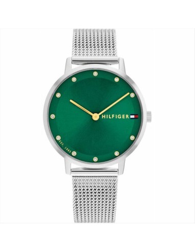 Orologio Tommy Hilfiger Pippa, solo tempo donna. Cassa rotonda in acciaio dal diametro di 35 mm e spessore di 6,2 mm. Quadrante verde con cristalli negli indici e lancette color oro. Vetro minerale e movimento al quarzo. Cinturino in acciaio silver maglia milano. Impermeabilità di 3 atm.