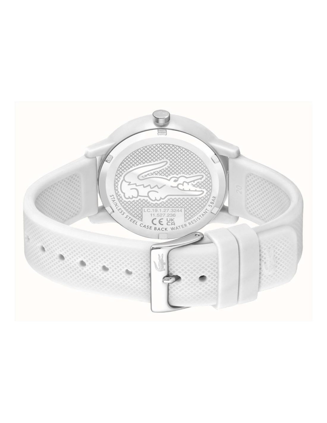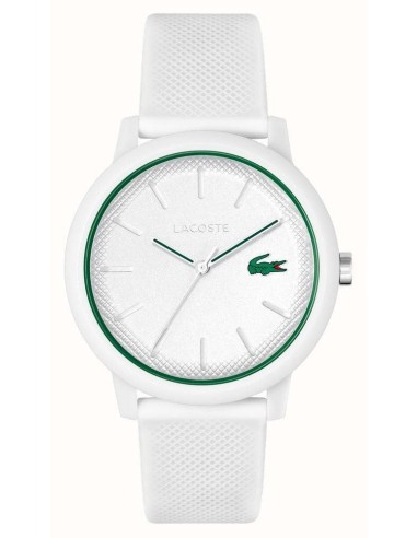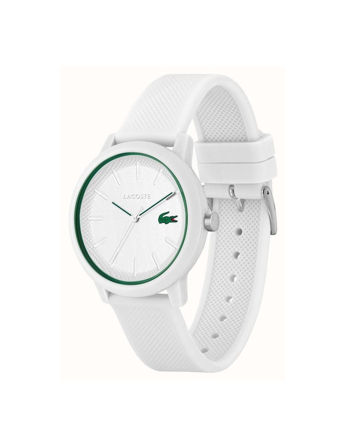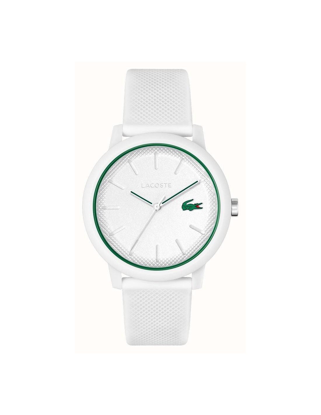 Orologio Lacoste 12.12, solo tempo uomo. Cassa in plastica bianca da 42 mm, quadrante bianco con indici bianchi e lancette verdi. Lunetta interna verde. Movimento al quarzo e vetro minerale. Cinturino in silicone bianco testurizzato che si chiude con una fibbia ad ardiglione. Impermeabilità di 3 atm.