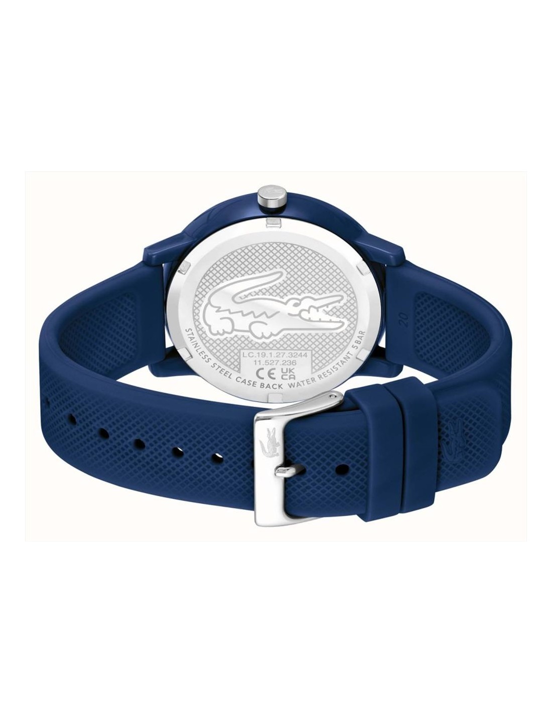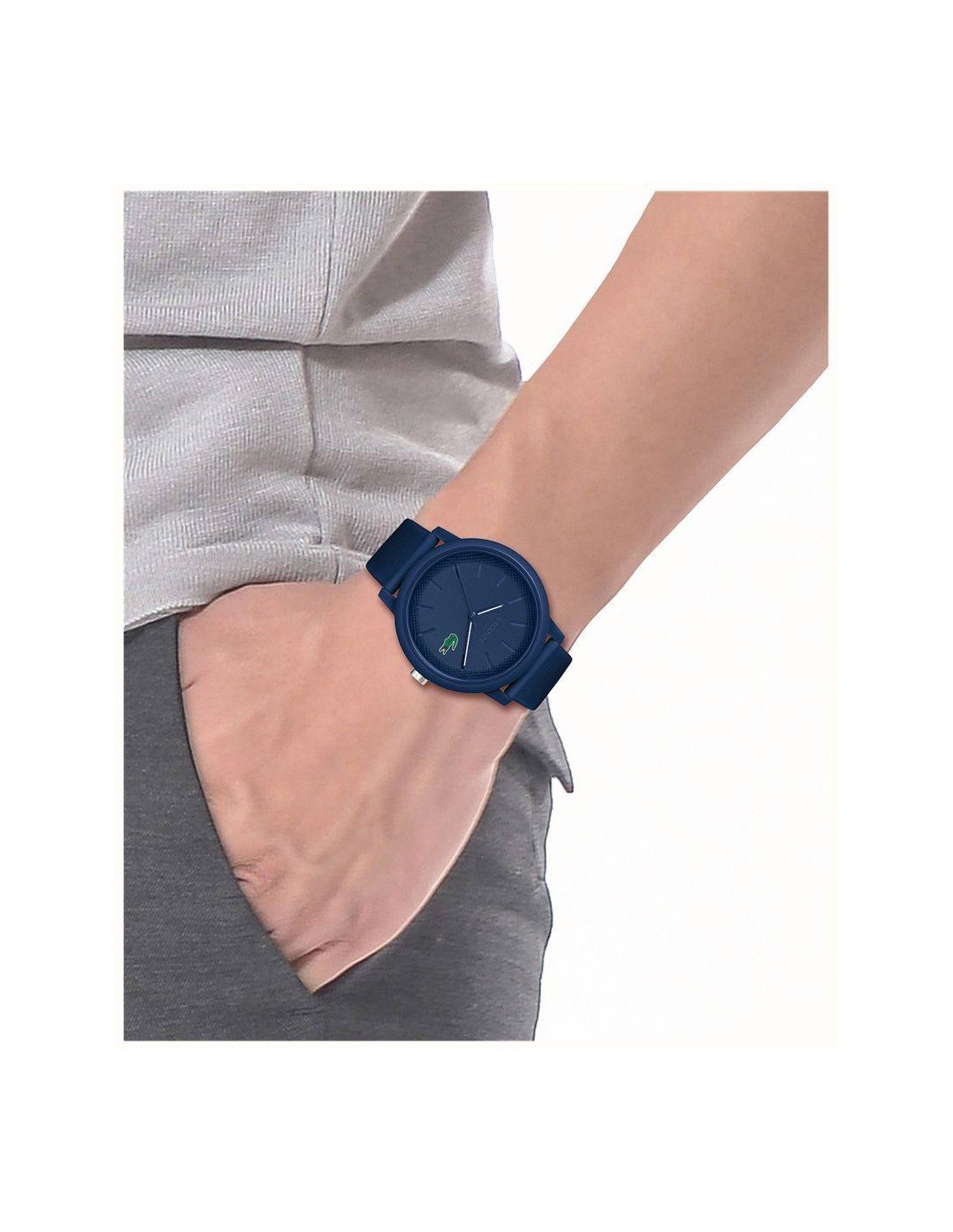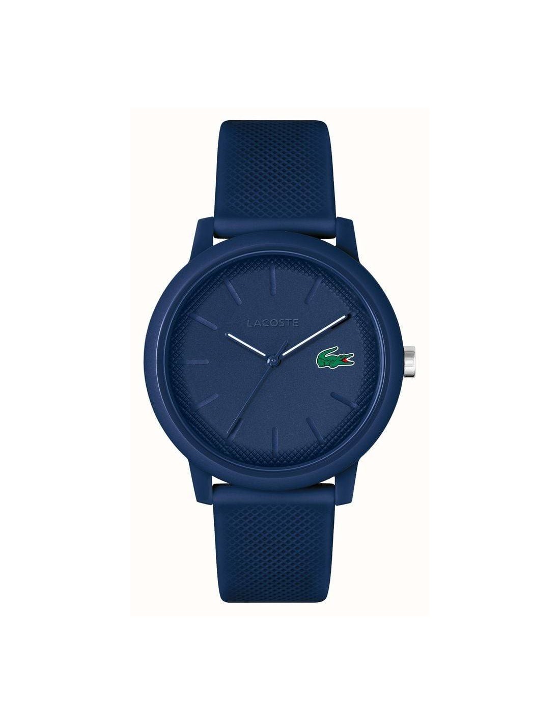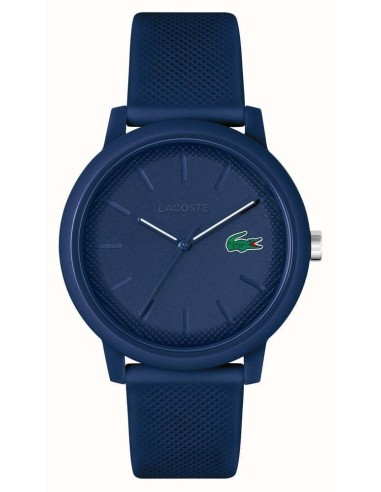 Orologio Lacoste 12.12, solo tempo uomo. Cassa in plastica blu da 42 mm, quadrante blu con indici blu e lancette bianche. Movimento al quarzo e vetro minerale. Cinturino in silicone blu testurizzato che si chiude con una fibbia ad ardiglione. Impermeabilità di 5 atm.