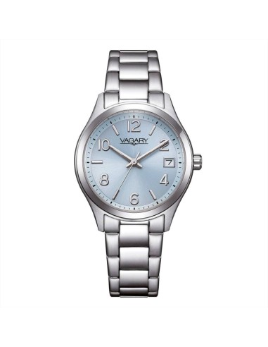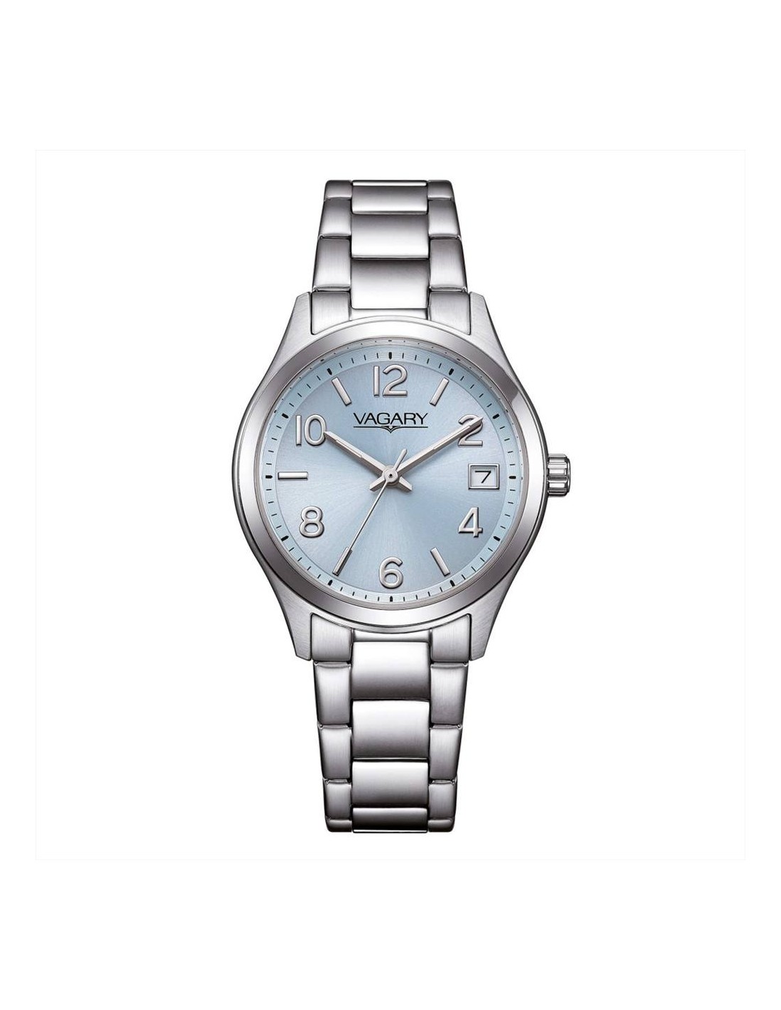 Orologio Vagary Timeless, solo tempo donna. Cassa in acciaio da 32 mm, quadrante celeste con numeri arabi e lancette silver, datario alle ore 3. Movimento al quarzo, vetro minerale, e cinturino in acciaio silver. Impermeabilità di 5 atm