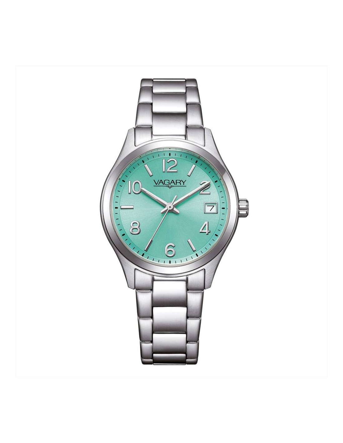 Orologio Vagary Timeless, solo tempo donna. Cassa in acciaio da 32 mm, quadrante verde acqua con numeri arabi e lancette silver, datario alle ore 3. Movimento al quarzo, vetro minerale, e cinturino in acciaio silver. Impermeabilità di 5 atm