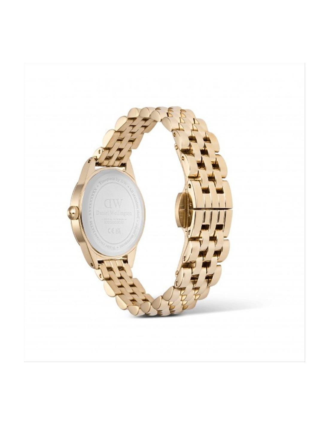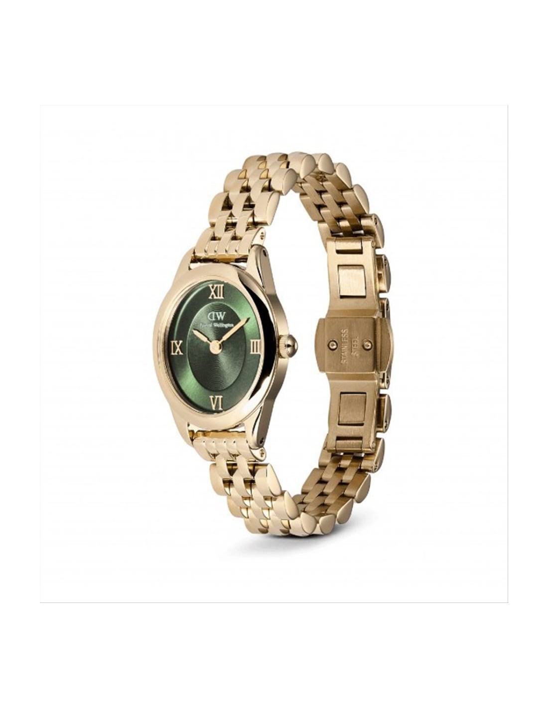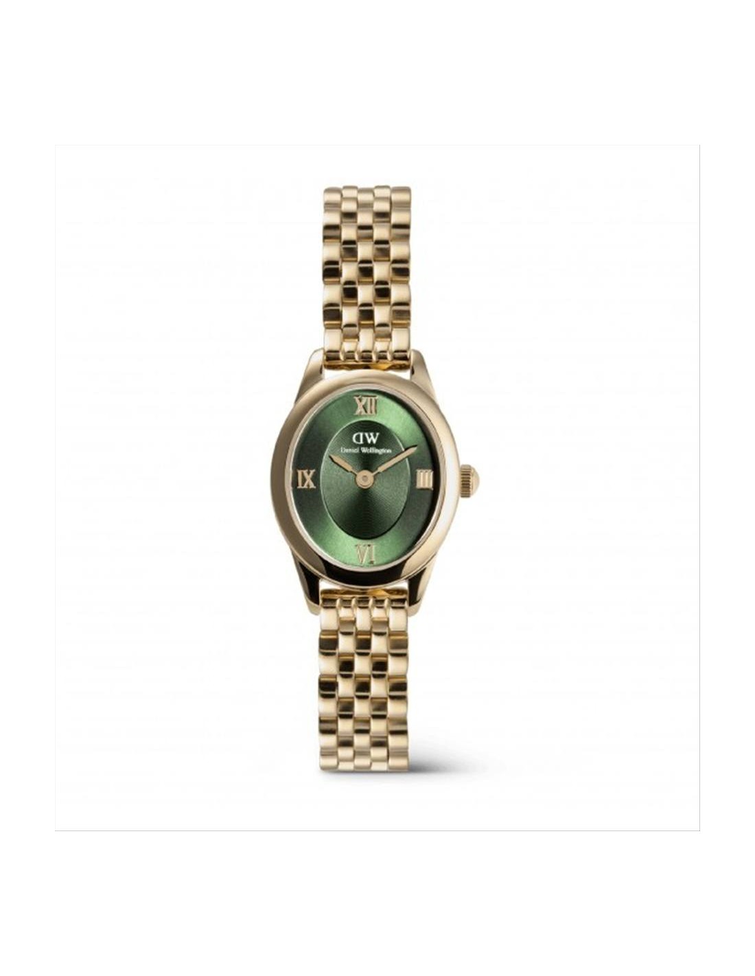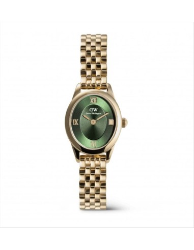 Orologio Daniel Wellington Juliette Braided, solo tempo donna. Cassa ovale in acciaio inossidabile pvd oro giallo di dimensioni 22 mm x 25,5 mm. Quadrante verde con numeri e lancette dorate. Movimento al quarzo e vetro minerale. Cinturino in acciaio pvd oro giallo. Impermabilità di 3 atm.