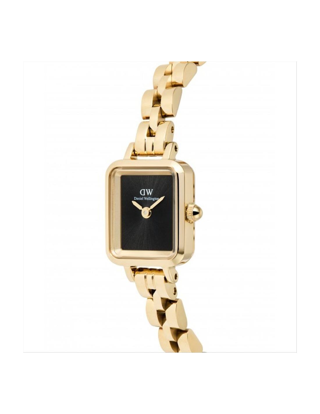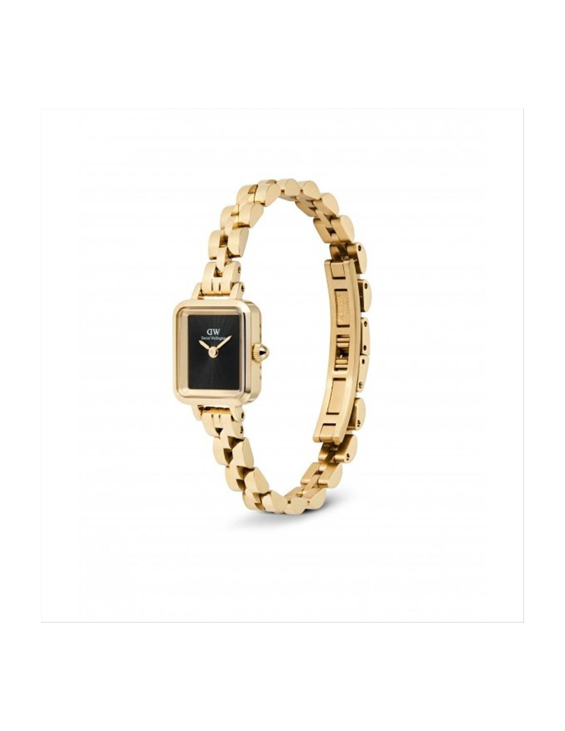 Orologio Daniel Wellington Quadro Mini Arch, solo tempo donna. Cassa rettangolare in acciaio inossidabile dorato extra small dimensione 15.4X18.2mm. Quadrante nero con lancette dorate. Movimento al quarzo e vetro minerale. Cinturino in acciaio pvd oro giallo con chiusura a scomparsa . Lunghezza regolabile dell'orologio: (Min - Max) 125-180 mm. Impermeabilità di 3 atm.