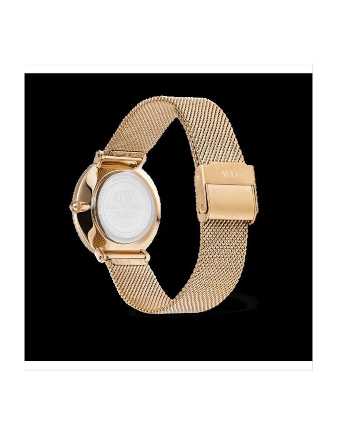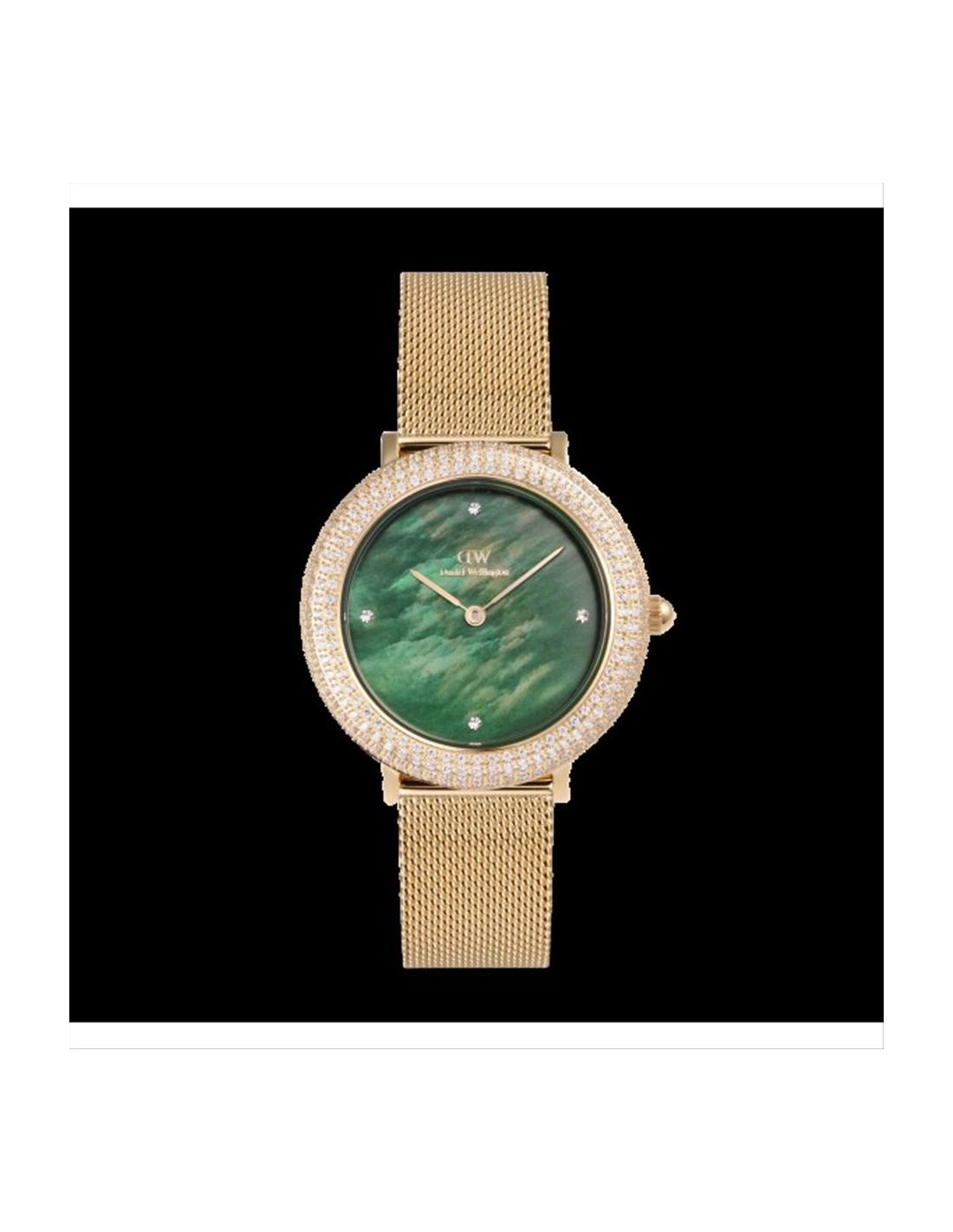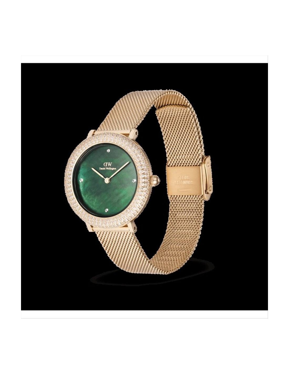 Orologio Daniel Wellington Crystalline Bezel, solo tempo donna. Cassa in acciaio dorato da 32 mm, quadrante in madreperla verde con cristalli e lancette dorate. Lunetta incastonata di cristalli, vetro minerale e movimento al quarzo. Cinturino in acciaio maglia milano dorato. Impermeabilità di 3 atm.