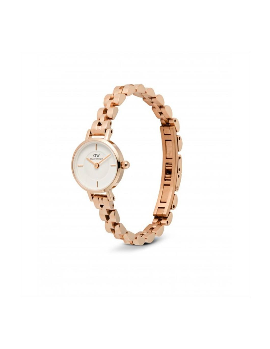 Orologio Daniel Wellington Petite Mini, solo tempo donna. Cassa rotonda in acciaio pvd oro rosa dal diametro di 19 mm. Quadrante bianco con indici e lancette rosè. Movimento al qurzo e vetro minerale. Cinturino in acciaio pvd oro rosa con chiusura a scomparsampermeabilità di 3 atm.