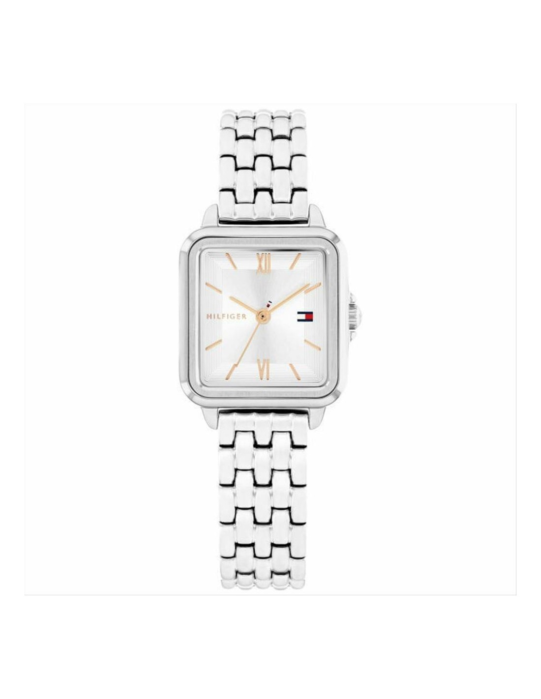 Orologio Tommy Hilfiger Mia, solo tempo donna. Cassa in acciaio di forma rettangolare da 24x22,5 mm. Quadrante silver con indici e lancette rosè. Vetro minerale e movimento al quarzo. Cinturino in acciaio. Impermeabilità di 3 atm.