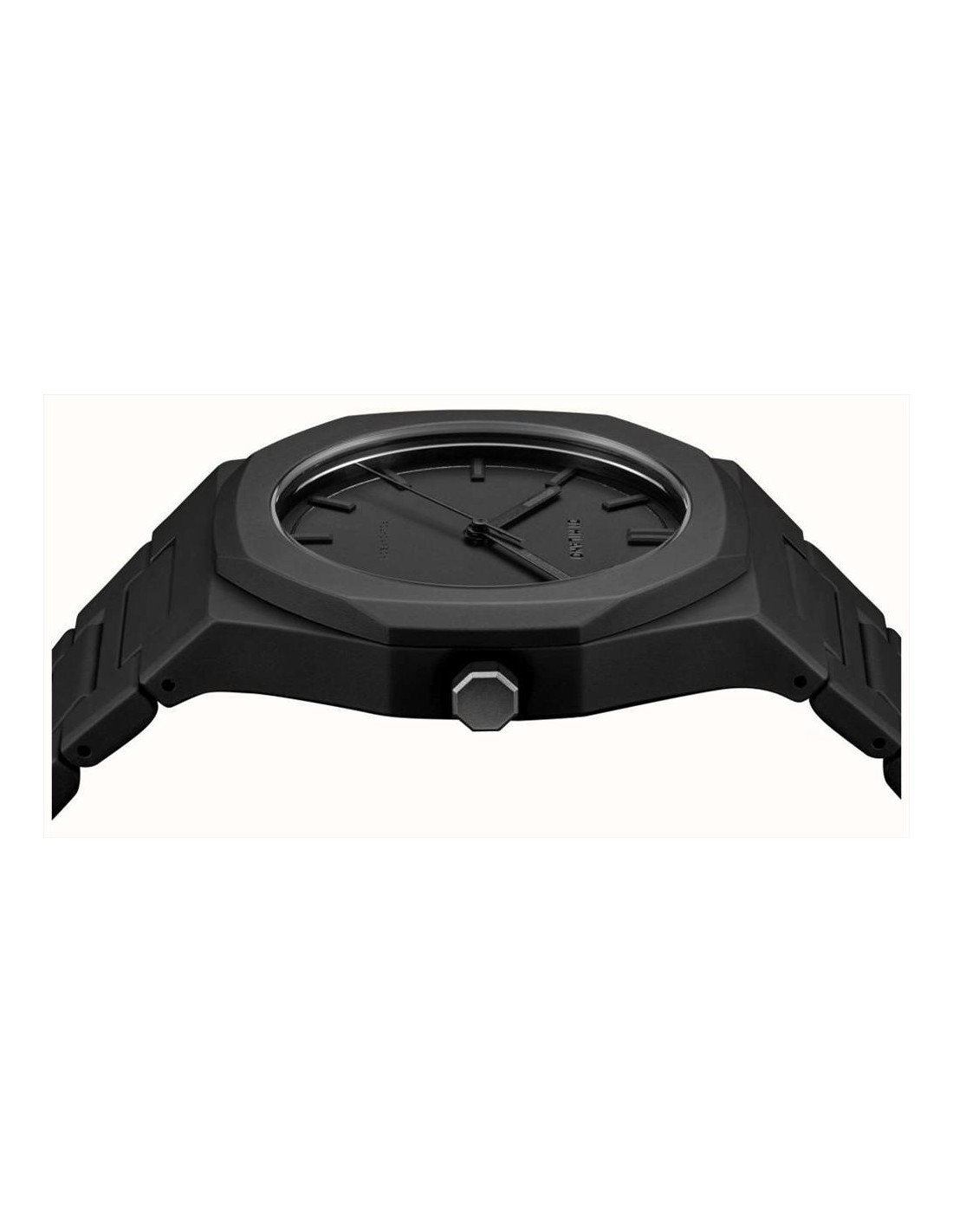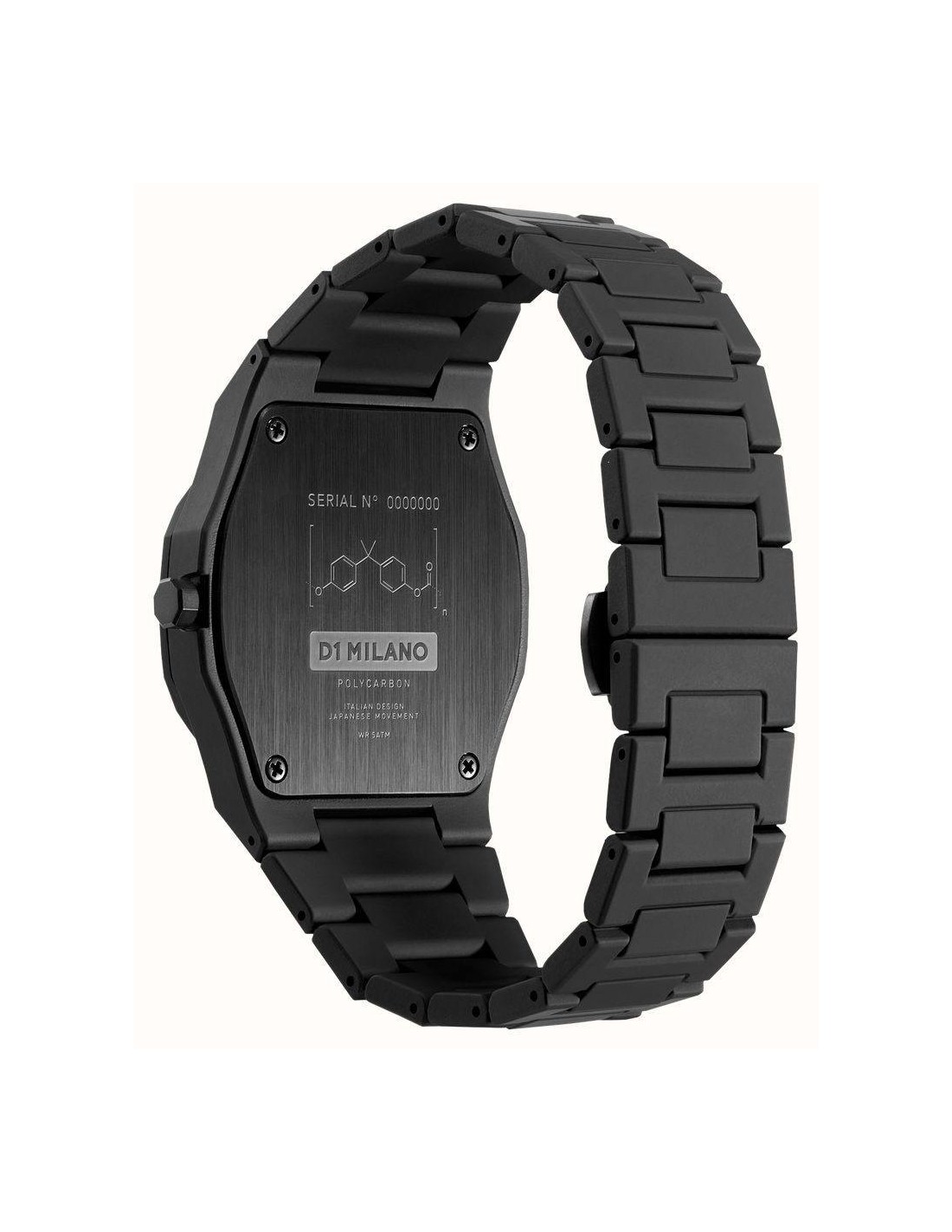 Orologio D1Milano Shadow, solo tempo. Cassa in policarbonato nero con finitura soft-touch di dimensioni 40,5 mm, quadrante nero opaco con indici e lancette nere. Lunetta in policarbonato ero e fondello in acciaio. Vetro minerale antiriflesso. Movimento al quarzo giapponese Seiko VJ21. Cinturino in policarbonato nero con finitura soft-touch. Impermeabilità di 5 atm. Il policarbonato è un materiale plastico molto leggero e resistente a graffi e urti. Orologio semplice ma innovativo nel design, con un unico colore per una scelta unica e per una personalità decisa.