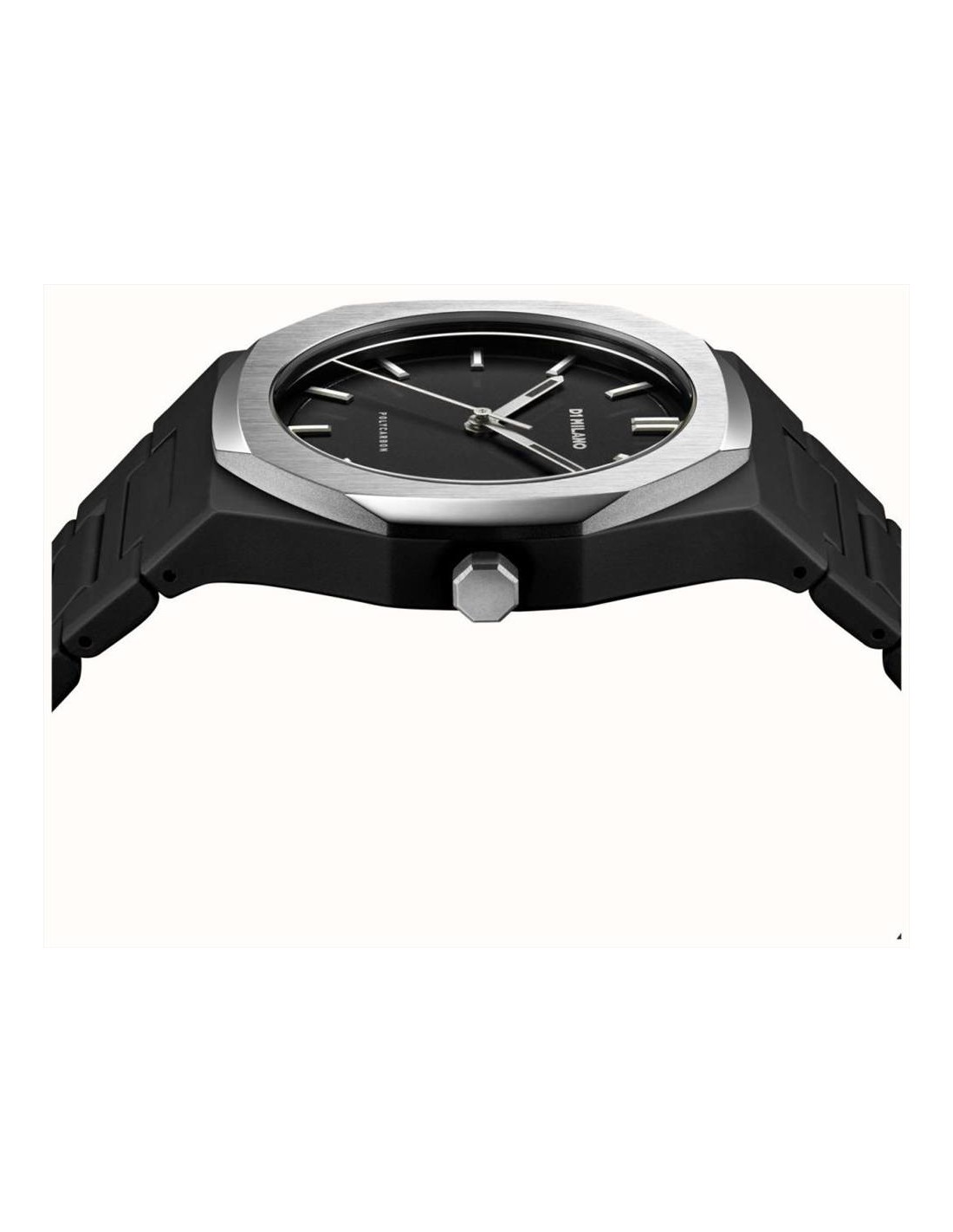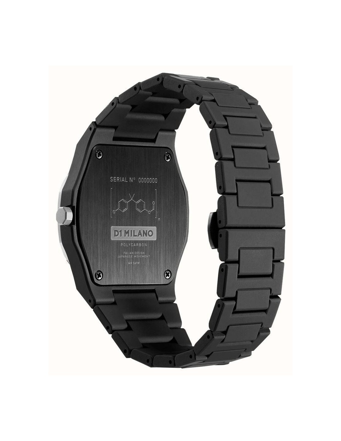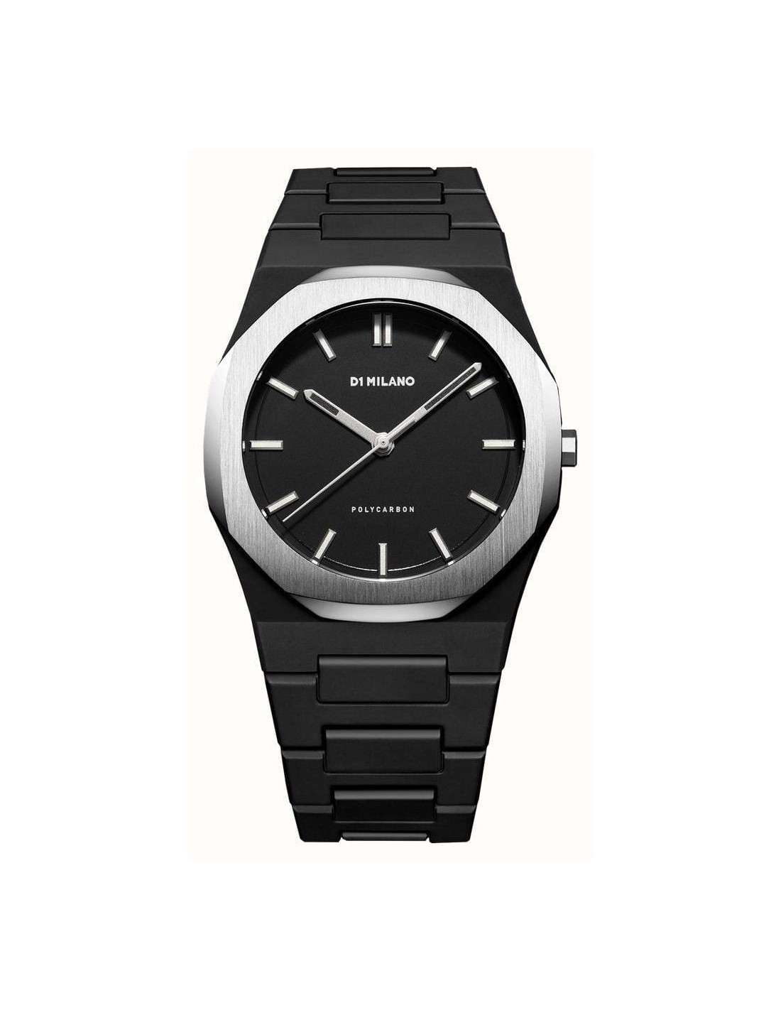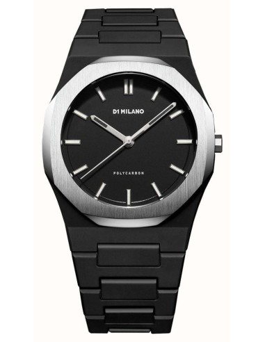 Orologio D1Milano Moonglade, solo tempo. Cassa in policarbonato nero con finitura soft-touch di dimensioni 40,5 mm, quadrante nero opaco con indici e lancette silver. Lunetta in acciaio e fondello in acciaio nero. Vetro minerale antiriflesso. Movimento al quarzo giapponese Seiko VJ21. Cinturino in policarbonato nero con finitura soft-touch. Impermeabilità di 5 atm. Il policarbonato è un materiale plastico molto leggero e resistente a graffi e urti. Orologio semplice ma innovativo nel design, con un unico colore per una scelta unica e per una personalità decisa.