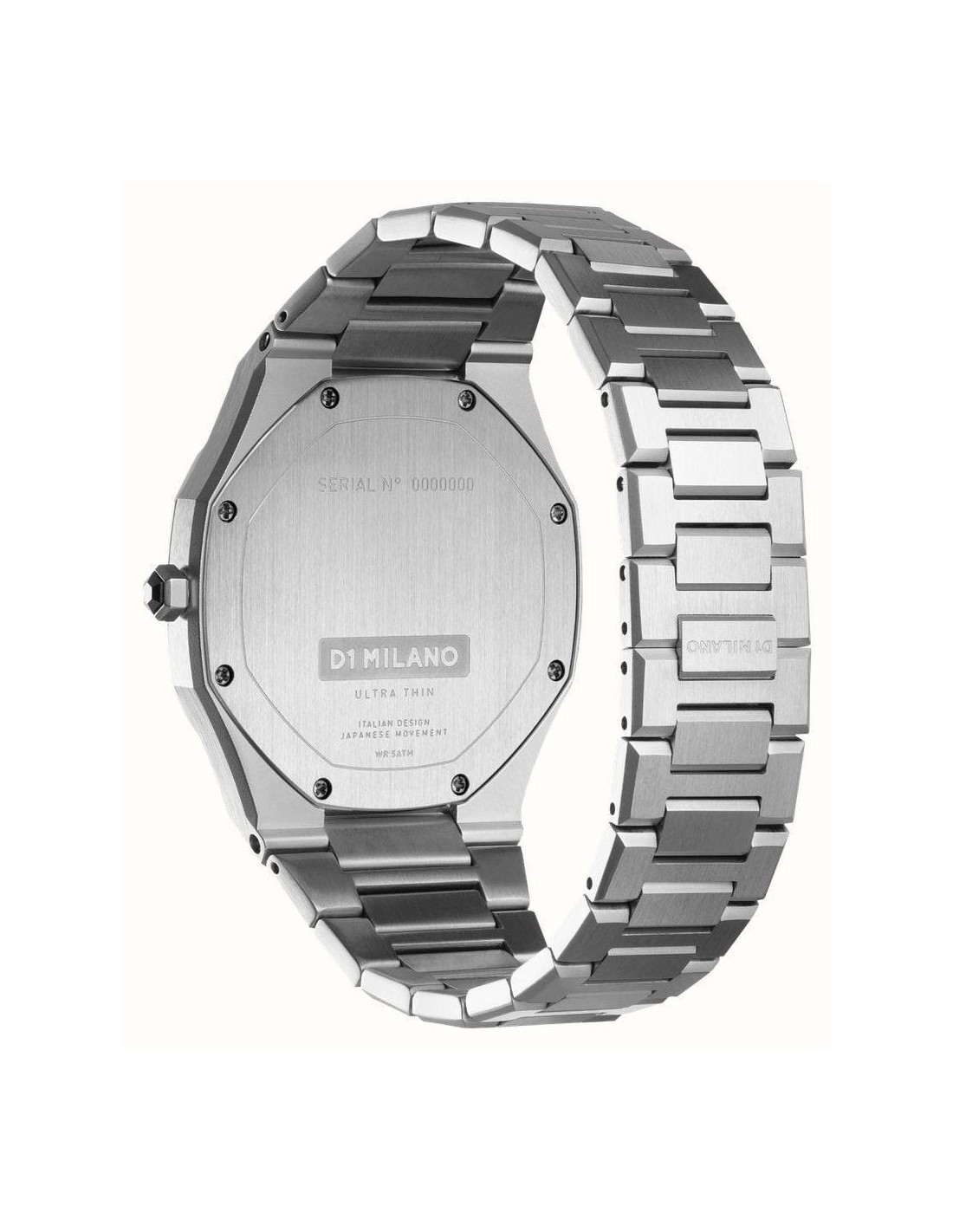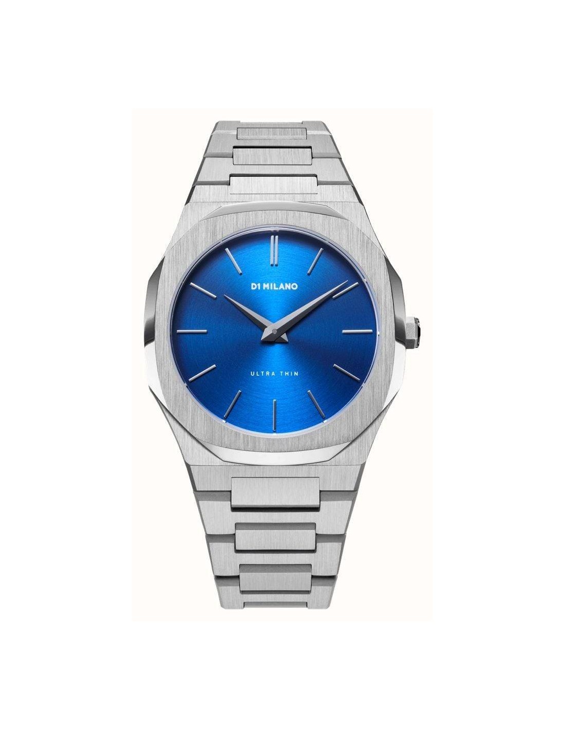 Orologio D1Milano Geo Ultra Thin, solo tempo. Cassa in acciaio inossidabile 316L, spazzolato e lucidato di dimensioni 40 mm, quadrante Blu con finitura a spazzola circolare con indici e lancette silver. Lunetta in acciaio. Vetro zaffiro, rivestimento antiriflesso. Movimento al quarzo Citizen Miyota 1L22. Cinturino in acciaio inossidabile che si chiude con una chiusura a farfalla nascosta. Impermeabilità di 5 atm.