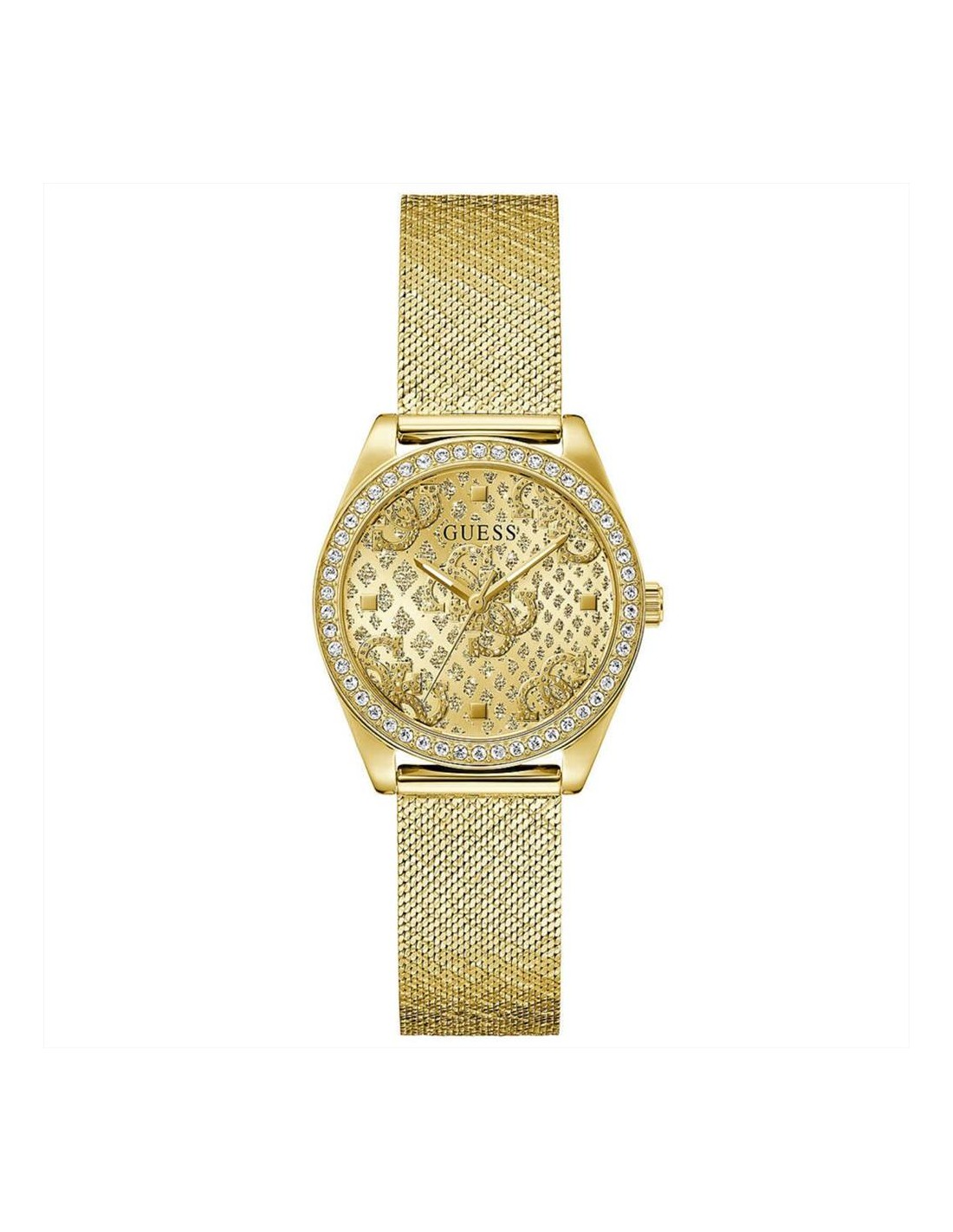 Orologio Guess Boa, solo tempo donna. Cassa rotonda in acciaio pvd oro giallo dal diametro di 32 mm. Quadrante dorato con glitter e lancette dorate luminescenti. Lunetta impreziosita da cristalli bianchi. Vetro minerale e movimento al quarzo. Cinturino in acciaio pvd oro giallo maglia milano. Impermeabilità di 3 atm