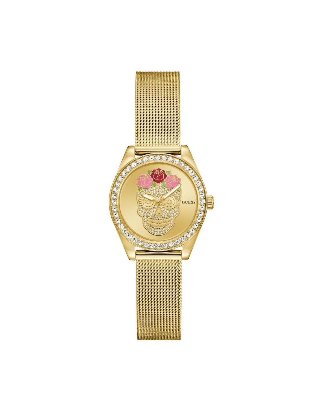 Orologio Guess Boa, solo tempo donna. Cassa rotonda in acciaio pvd oro giallo dal diametro di 30 mm. Quadrante dorato con zirconi, teschio e rose colorate, e lancette dorate luminescenti. Lunetta impreziosita da cristalli bianchi. Vetro minerale e movimento al quarzo. Cinturino in acciaio pvd oro giallo maglia milano. Impermeabilità di 3 atm
