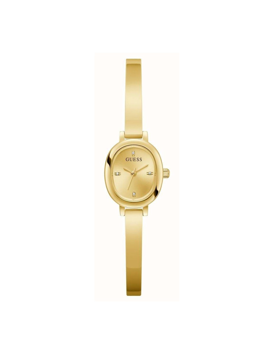 Orologio Guess Penelope, solo tempo donna. Cassa in acciaio pvd oro giallo di forma ovale da 21 mm. Quadrante dorato con cristalli e lancette dorate. Vetro minerale e movimento al quarzo. Cinturino in acciaio pvd oro giallo. Impermeabilità di 3 atm.