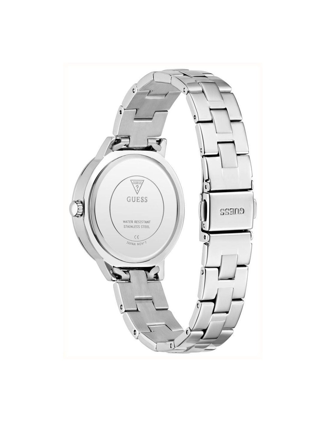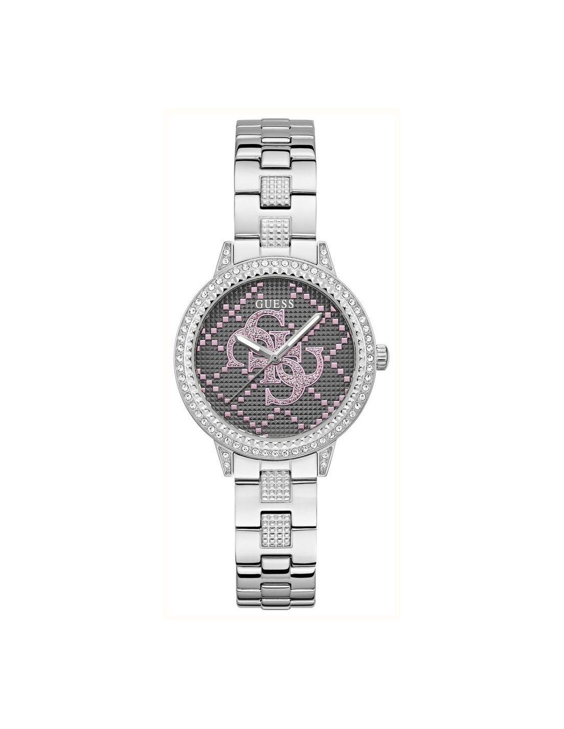 Orologio Guess G Lace, solo tempo donna. Cassa rotonda in acciaio inox dal diametro di 34 mm. Lunetta impreziosita da cristalli bianchi. Quadrante grigio scuro con logo "G" quattro in cristallo rosa, lancette luminescenti. Vetro minerale e movimento al quarzo. Cinturino in acciaio anallergico silver. Impermeabilità di 3 atm.