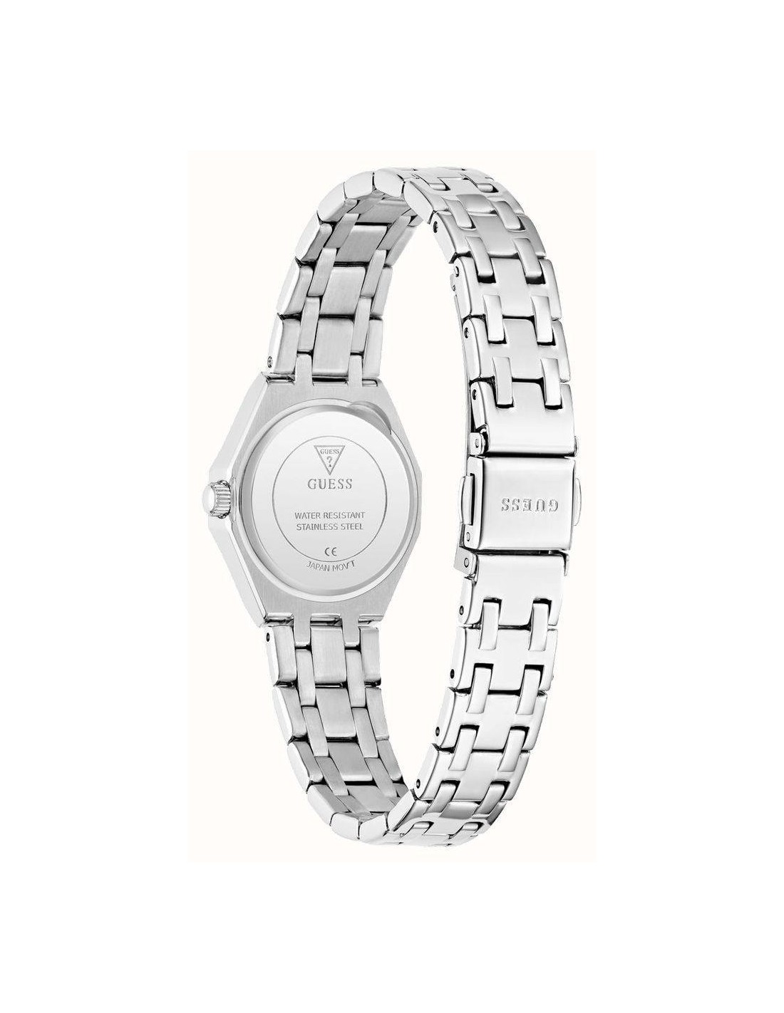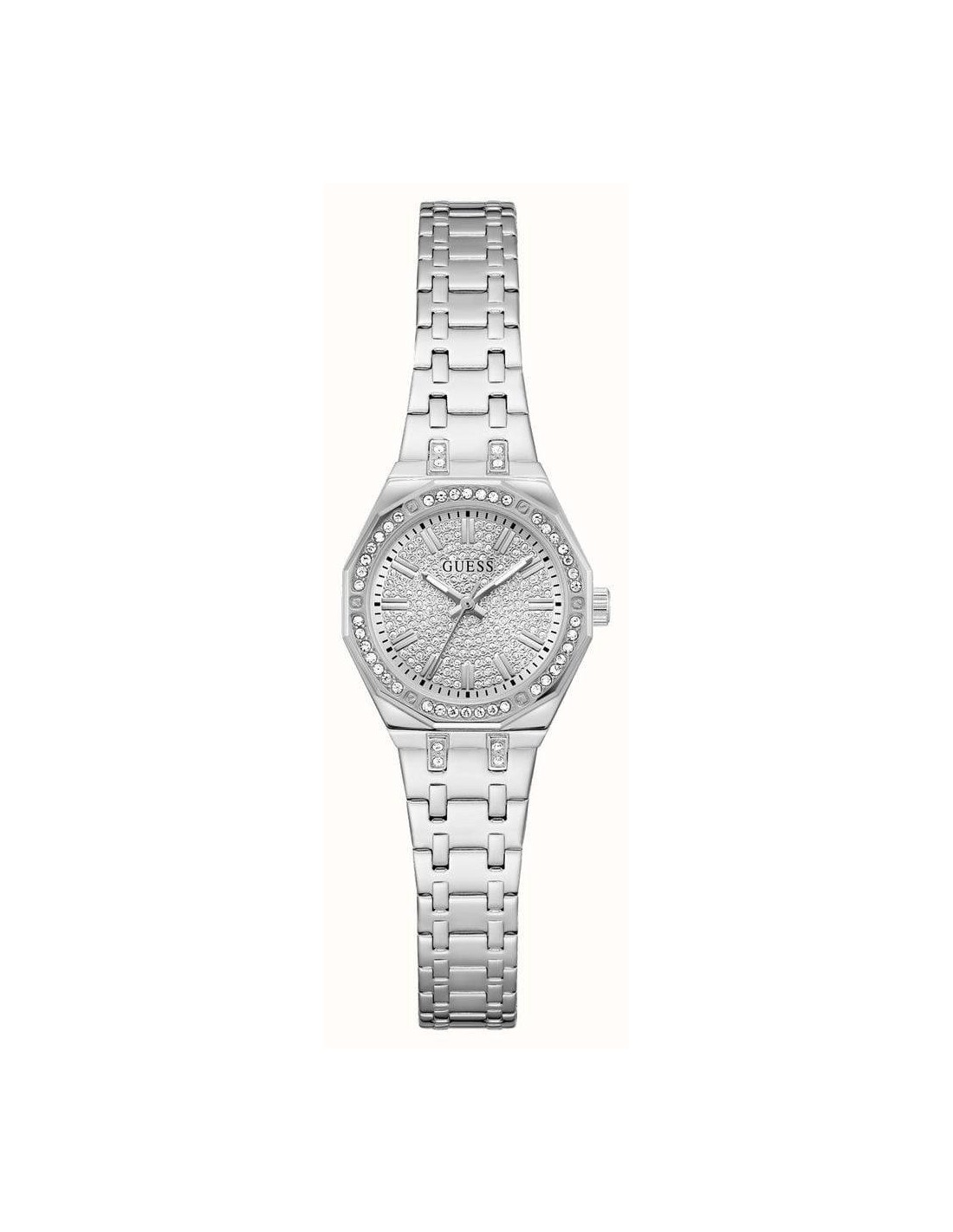 Orologio Guess Pixie, solo tempo donna. Cassa in acciaio in acciaio silver da 25 mm. Quadrante silver con cristalli e lancette silver. Lunetta impreziosita da cristalli. Vetro minerale e movimento al quarzo. Cinturino in acciaio silver con cristalli. Impermeabilità di 3 atm.
