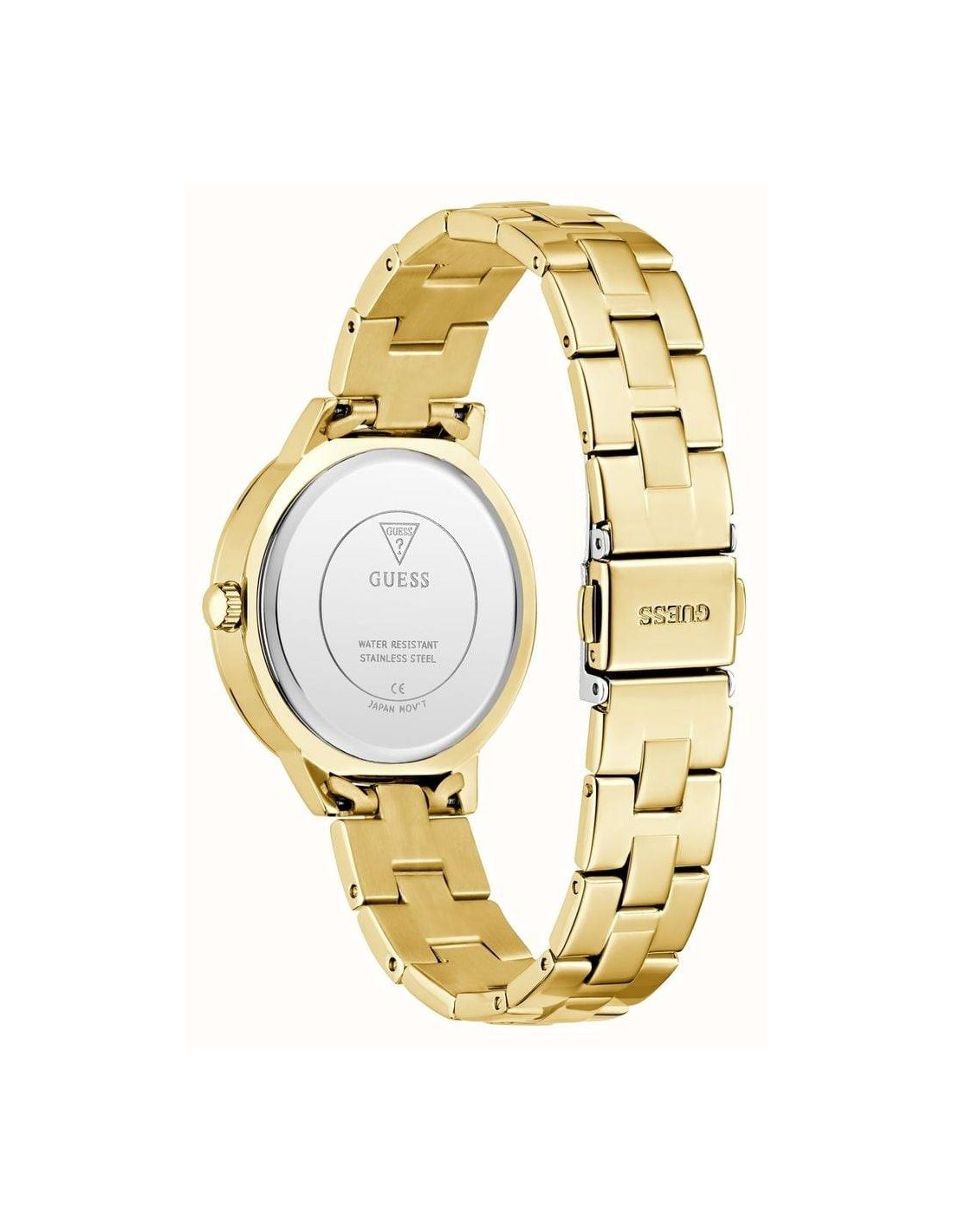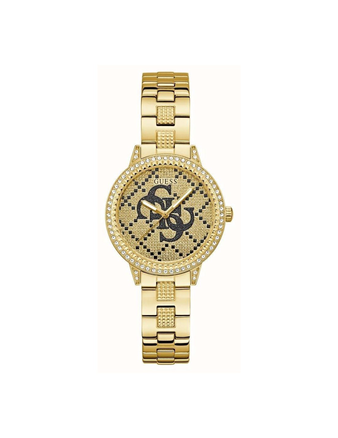 Orologio Guess G Lace, solo tempo donna. Cassa rotonda in acciaio dorato dal diametro di 34 mm. Lunetta impreziosita da cristalli bianchi. Quadrante dorato con logo "G" quattro e strass neri, lancette luminescenti. Vetro minerale e movimento al quarzo. Cinturino in acciaio dorato. Impermeabilità di 3 atm.